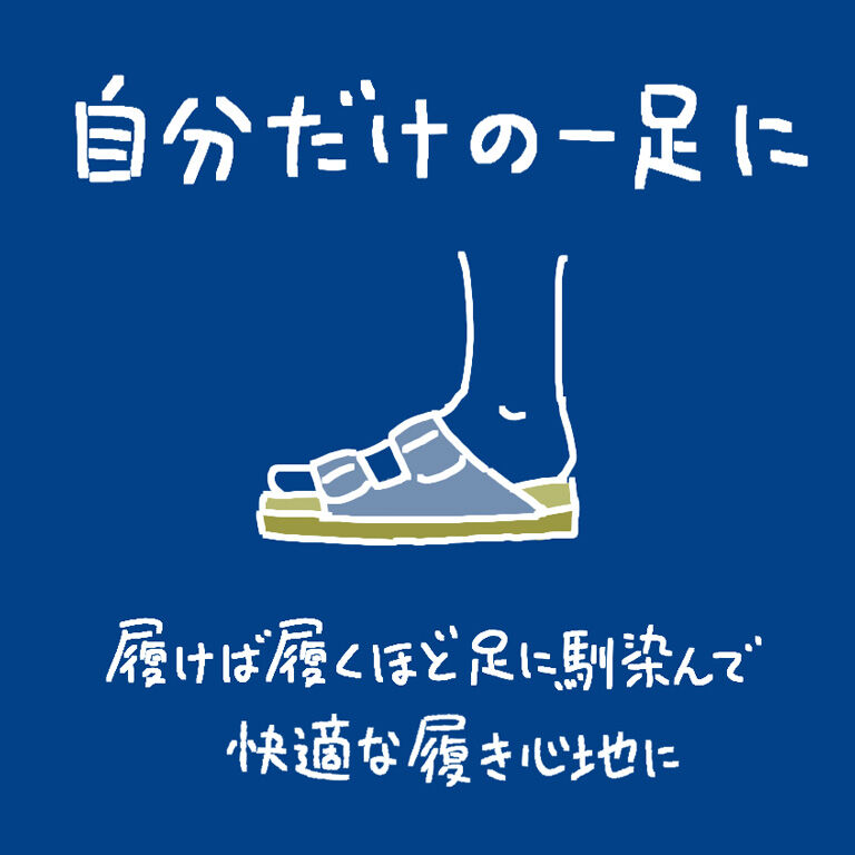 独自のフットベッドは、機能が備わっており、まるで砂浜の上を歩いているかのような、自然な歩行をサポートしています。また、履けば履くほど足に馴染んでいき、時間とともにあなただけの一足となります。そんな愛着が生まれた一足をリペアして長く履き続けられるのもビルケンシュトックならでは。