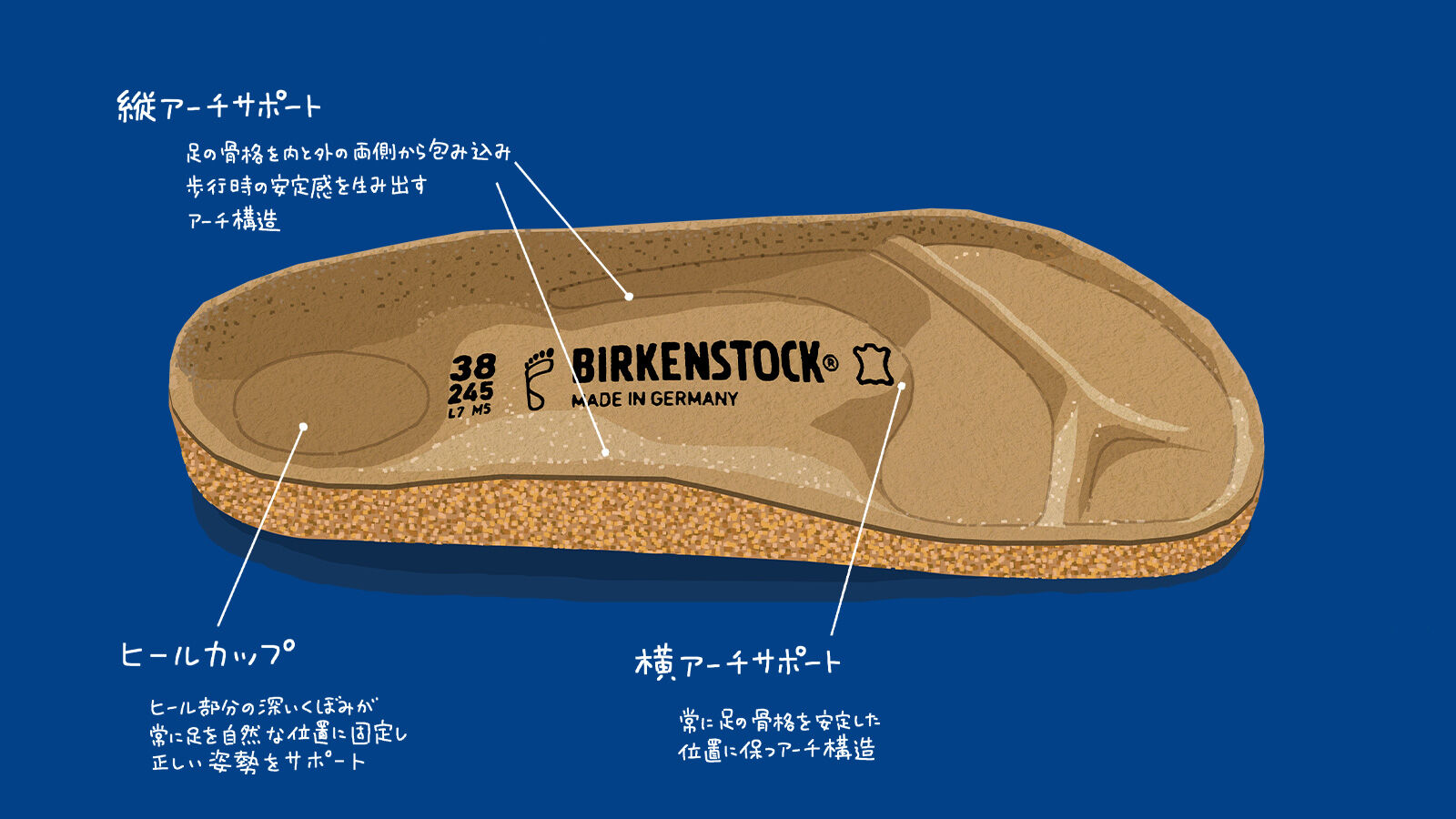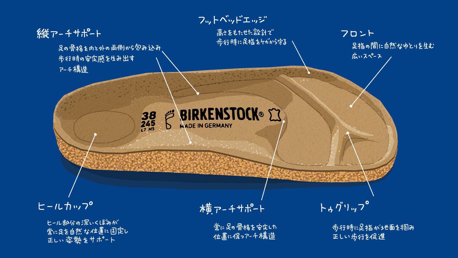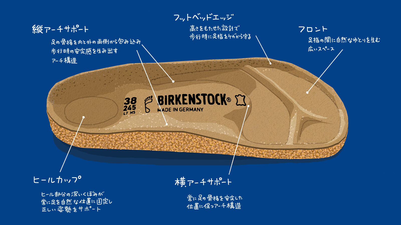ビルケンシュトックが独自に開発したフットベッドは、人にとって一番自然な歩行ができるように作られています。フットベッドに施された凹凸は、一つ一つが機能を持っており、しっかりと足をサポートします。