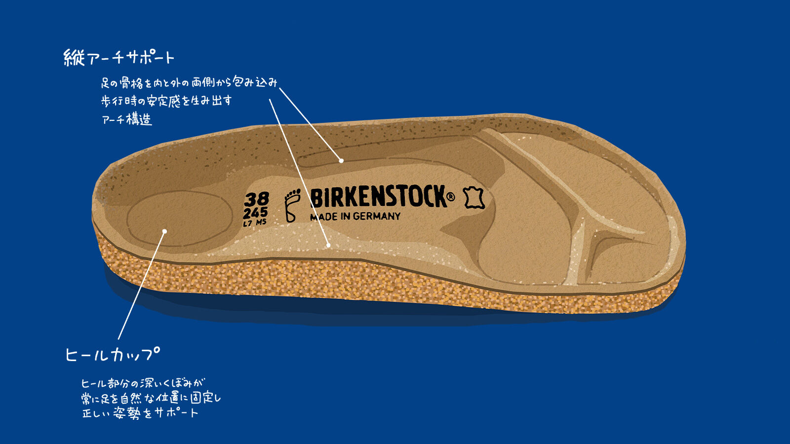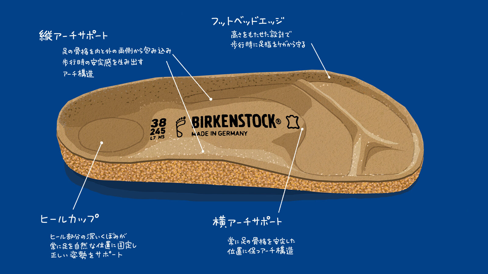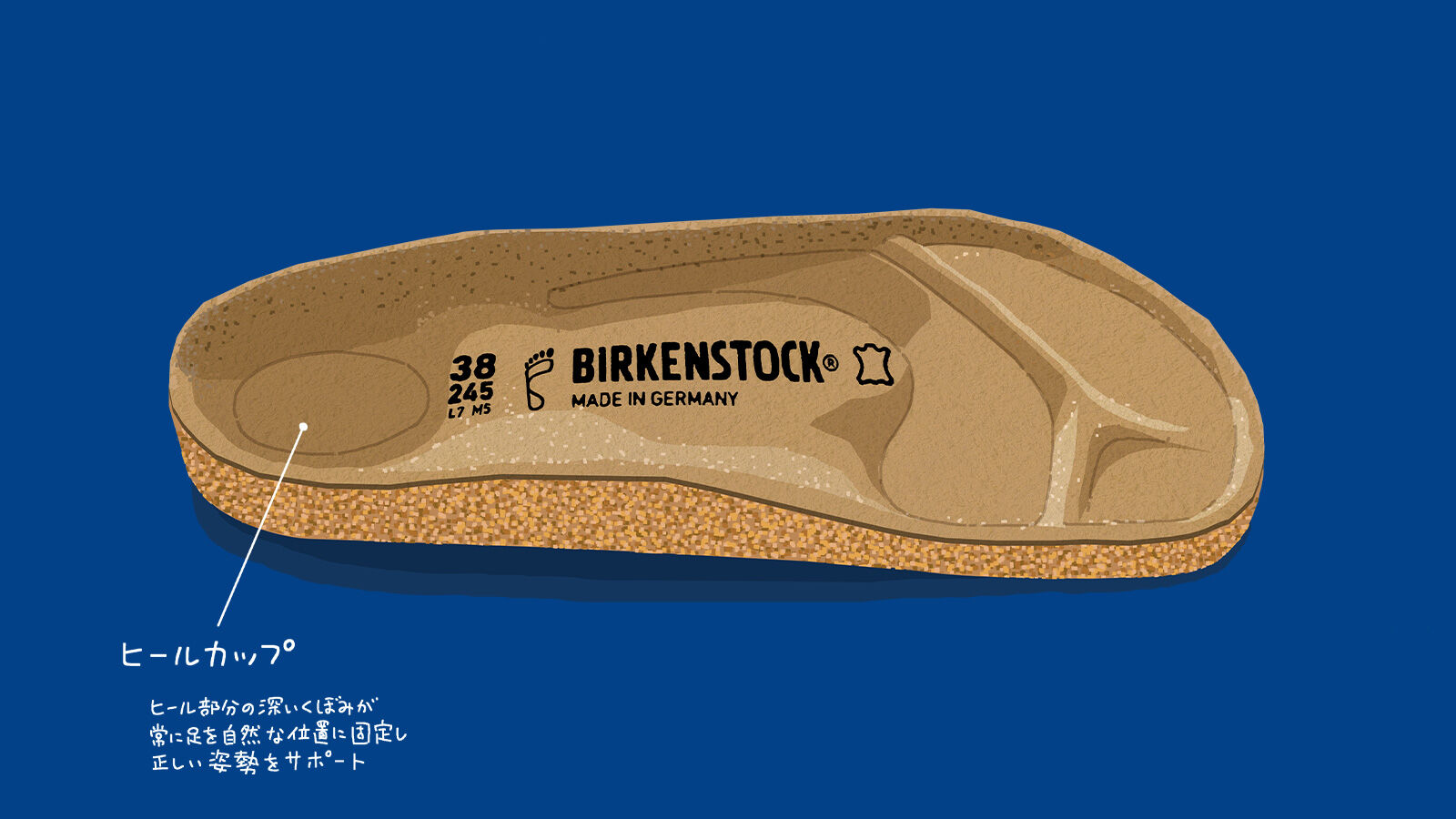ビルケンシュトックが独自に開発したフットベッドは、人にとって一番自然な歩行ができるように作られています。フットベッドに施された凹凸は、一つ一つが機能を持っており、しっかりと足をサポートします。