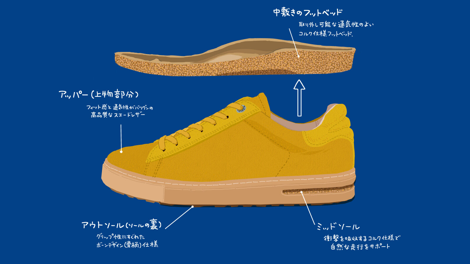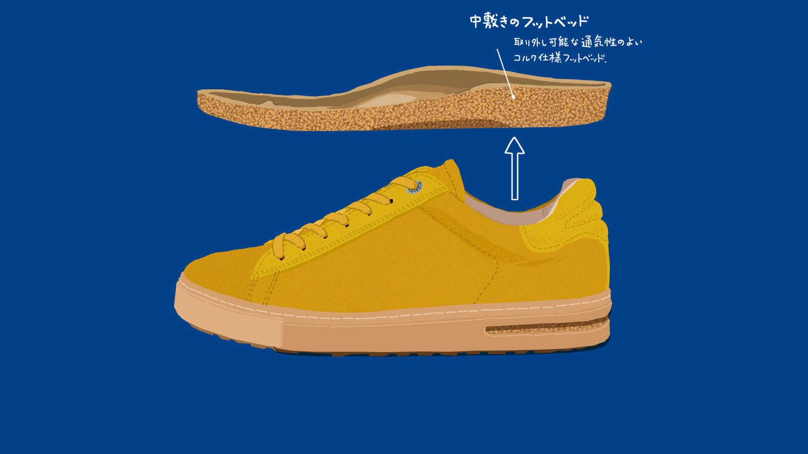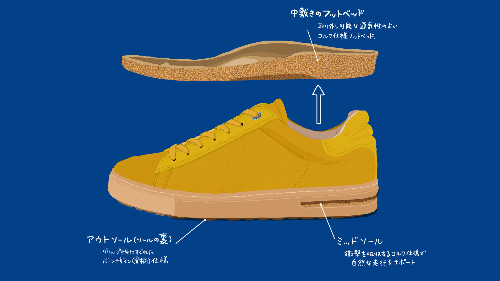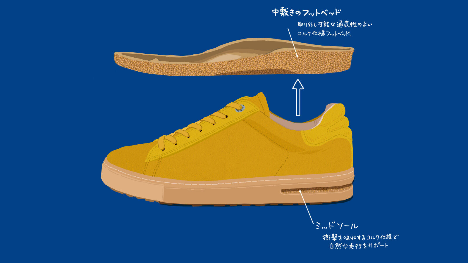 20FWシーズンの新モデル・レザースニーカーのBEND LOW(ベンド ロー)。ビルケンシュトックのサンダルの快適さをそのままスニーカーにも適用し、取り外し可能なフットベッドを搭載。サポート性の高いミッドソールと、かかとにコルクが見える特徴的なモデル。