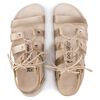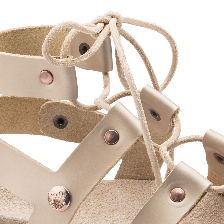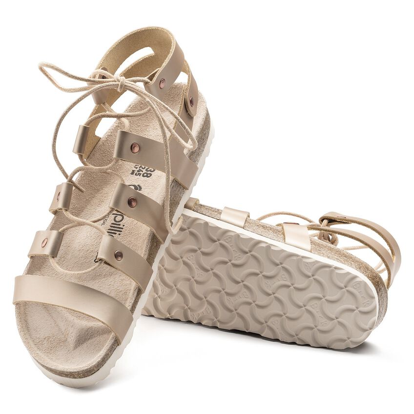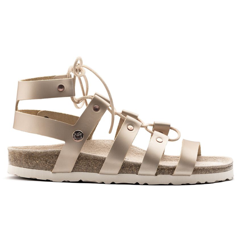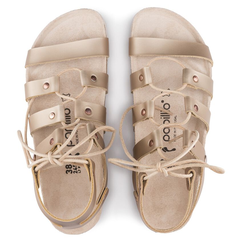Papillio/パピリオのCleo/クレオはデリケートなレースアップスタイルで安定感も高いグラディエーターサンダルです。天然ゴム混合コルクフットベッドが着用時の快適さ、履き心地やフィット感をかなえます。艶消し仕上げのメタリックレザーにナチュラルヌードレザーが上品で洗練されたコントラストを与えます。カラーバリエーションはローズとシルバーをご用意しています。