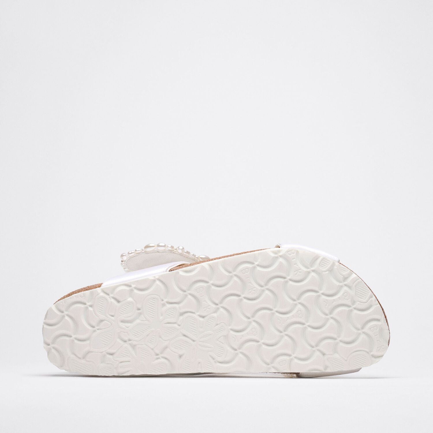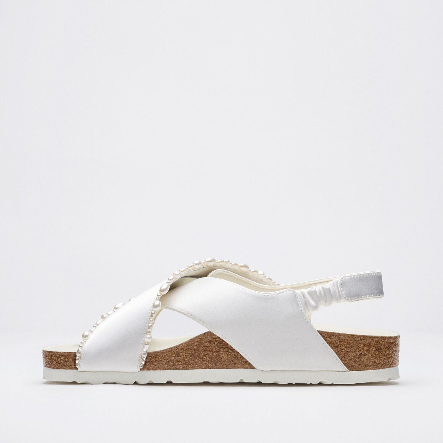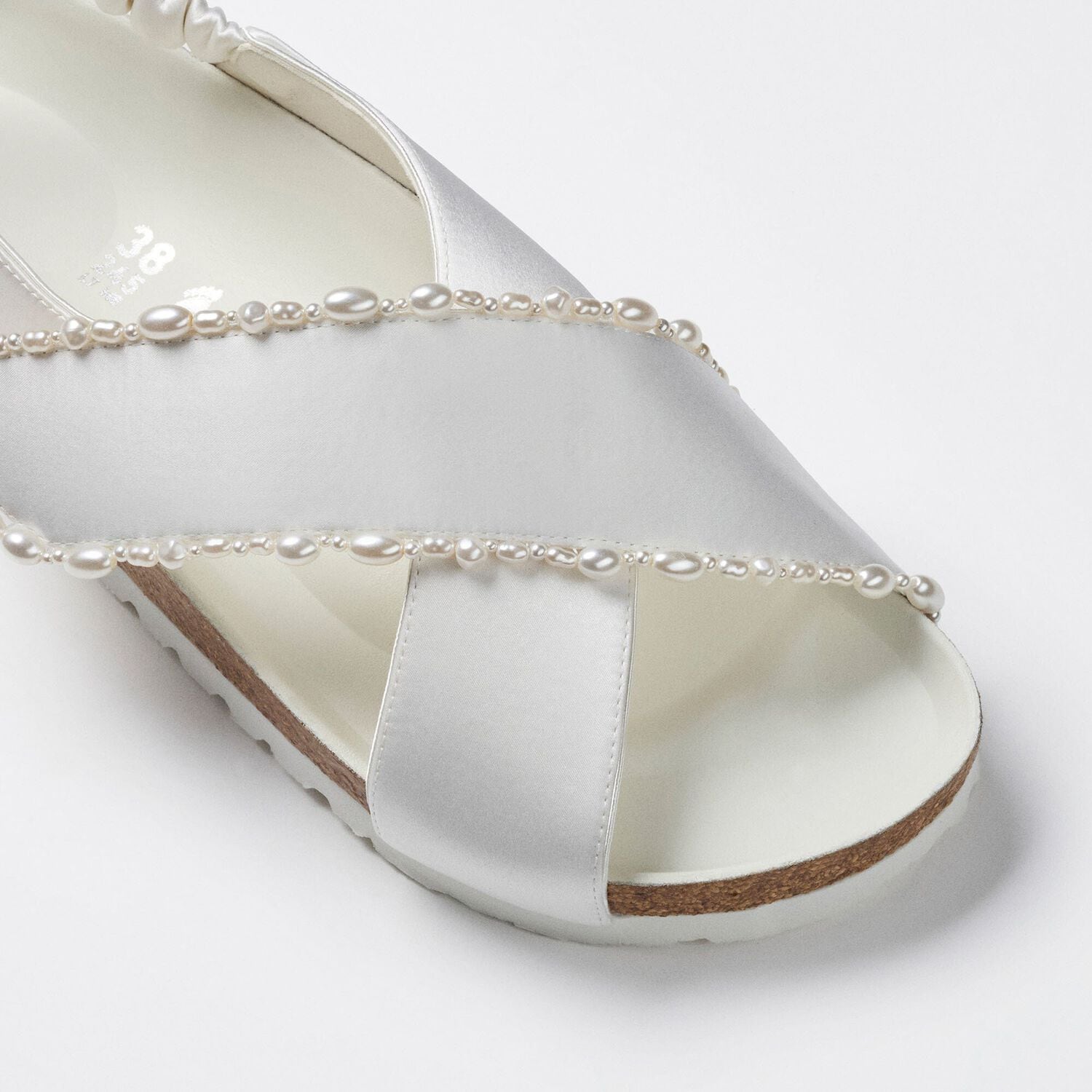 アッパー:上質なサテン、トリムに手作業でステッチされた不揃いでナチュラル感たっぷりのパール