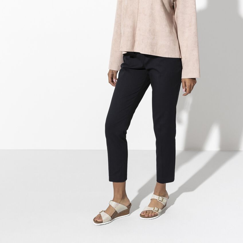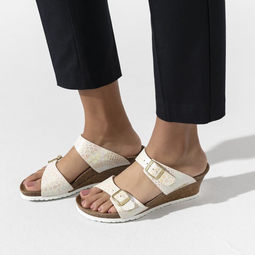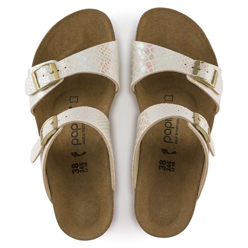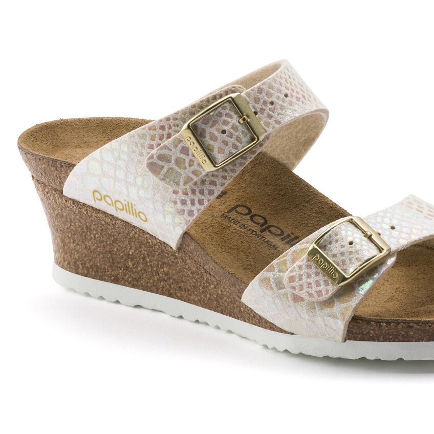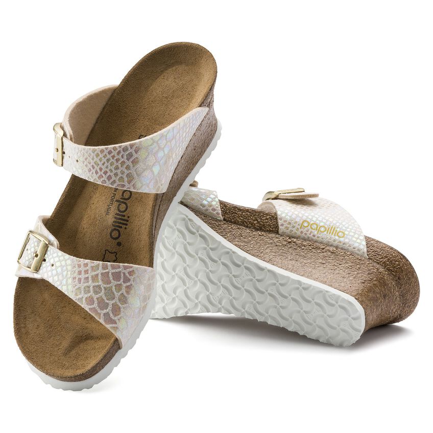 女性らしい装いのPapillio/パピリオのDorothy/ドロシーは、いろいろな機会に履けるウェッジヒール。本当に楽にコーディネートできるストラップサンダルです。ほのかに輝くシャイニー スネーク デザインのこのモデルは、虹色に光るメタリック フィルムのスネークスキンルックが優雅さと贅沢さを醸し出しています。ネイチャーにヒントを得たデザインと履き心地で、他のどのサンダルにも負けません。アッパー素材には肌に優しく耐久性に富んだ合成素材、Birko-Flor®が使われています。