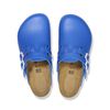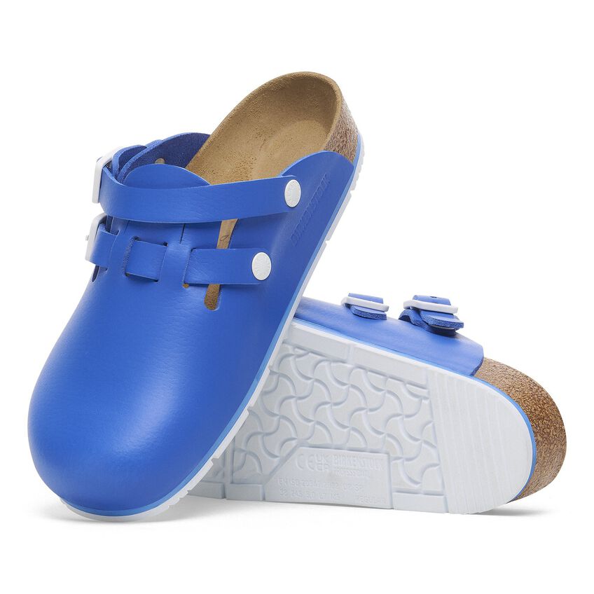 ダブルストラップクロッグ、Birkenstock Kay。1本はアッパー用、そしてもう1本は控えめに取り付けられたリベットを使ってかかと方向に倒し、バックストラップとして使用することもできます。要らないときにはくるっとアッパー側に倒しておくだけです。このモデルは、特に軽やかなポリウレタン製ソールが自慢です。滑りにくく、ダイナミックなローリング運動が可能な一足です。アッパー素材にはポリウレタン(PU)コーティングを施した上質なソフトナチュラルレザーを使用しています。PUコーティングは素材からムレを逃がし、クロッグの快適な通気を確保してくれます。