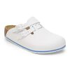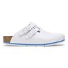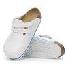 ダブルストラップクロッグ、Birkenstock Kay。1本はアッパー用、そしてもう1本は控えめに取り付けられたリベットを使ってかかと方向に倒し、バックストラップとして使用することもできます。要らないときにはくるっとアッパー側に倒しておくだけです。このモデルは、特に軽やかなポリウレタン製ソールが自慢です。滑りにくく、ダイナミックなローリング運動が可能な一足です。アッパー素材にはポリウレタン(PU)コーティングを施した上質なソフトナチュラルレザーを使用しています。PUコーティングは素材からムレを逃がし、クロッグの快適な通気を確保してくれます。