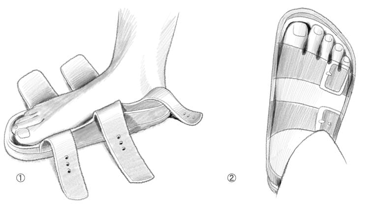 あまりきつくはせずに、ぴったりと足を包むような状態でベルトを締めます。歩行の際、足が締め付けられることが無いように、少し余裕を持たせます。