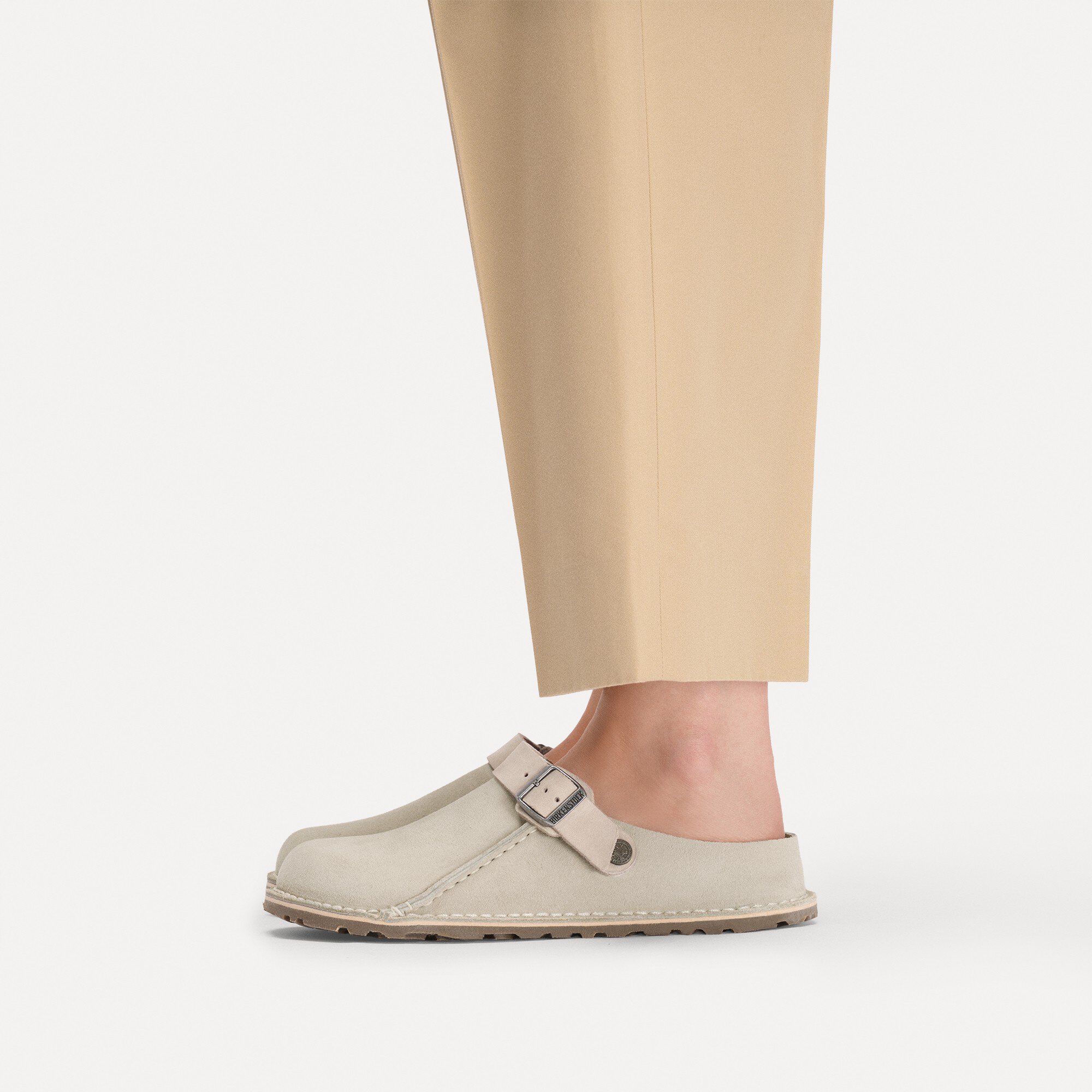 ビルケンシュトック Lutryは、ストラップをバックストラップとして使うことも、倒してオープンクロッグのように履くこともできる使い勝手の良い一足です。砂浜に残った自然な足跡を模して設計されたこのフットベッドで、一日中快適な履き心地を満喫してください。とてもソフトなスエードレザーをアッパーに使用しナチュラル感をたっぷりアピールしています。