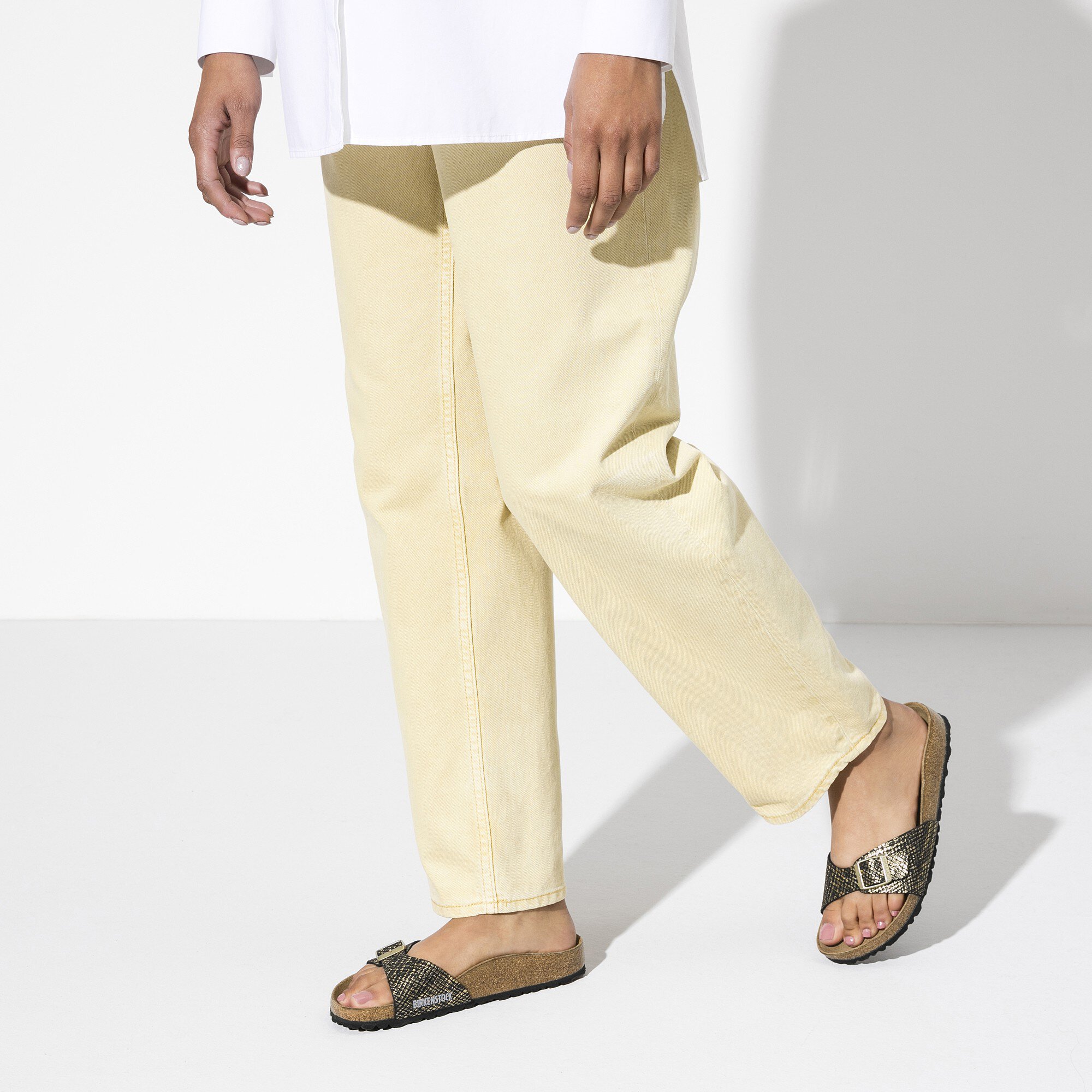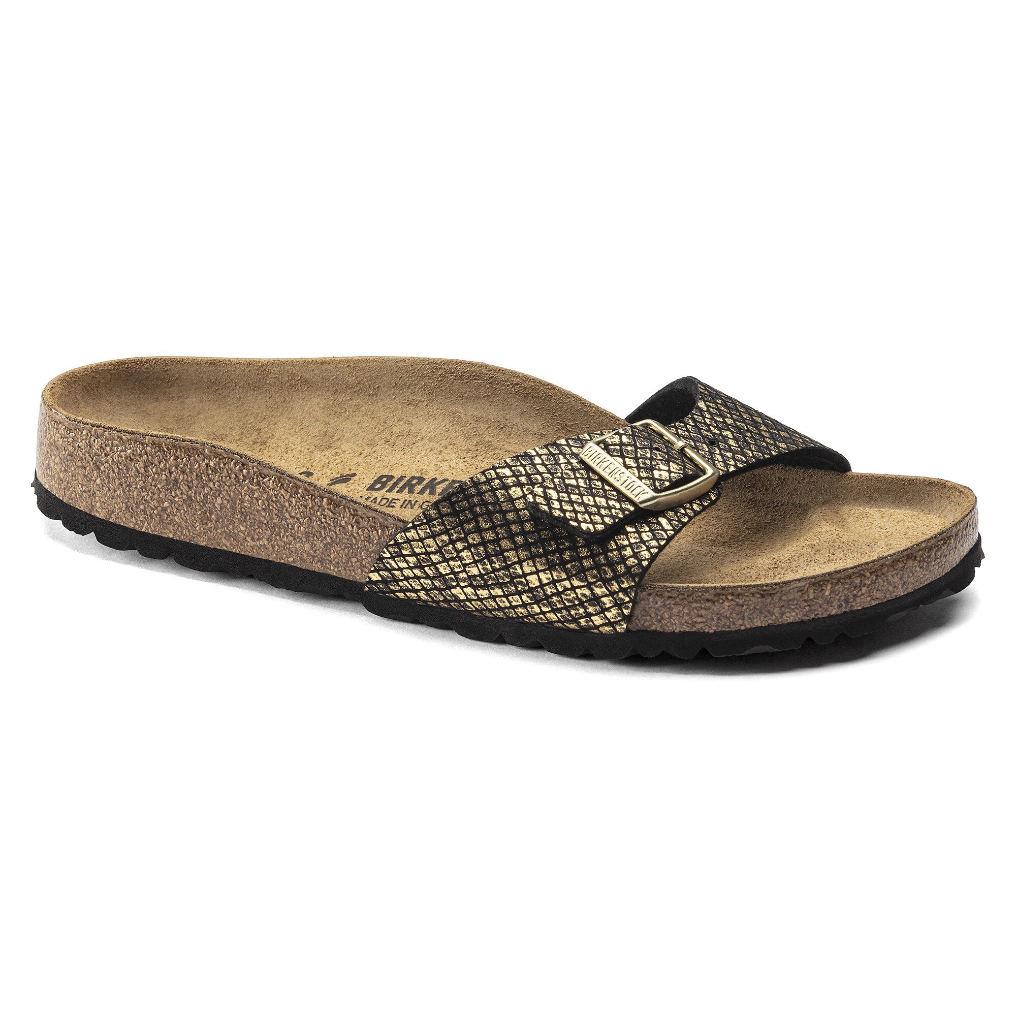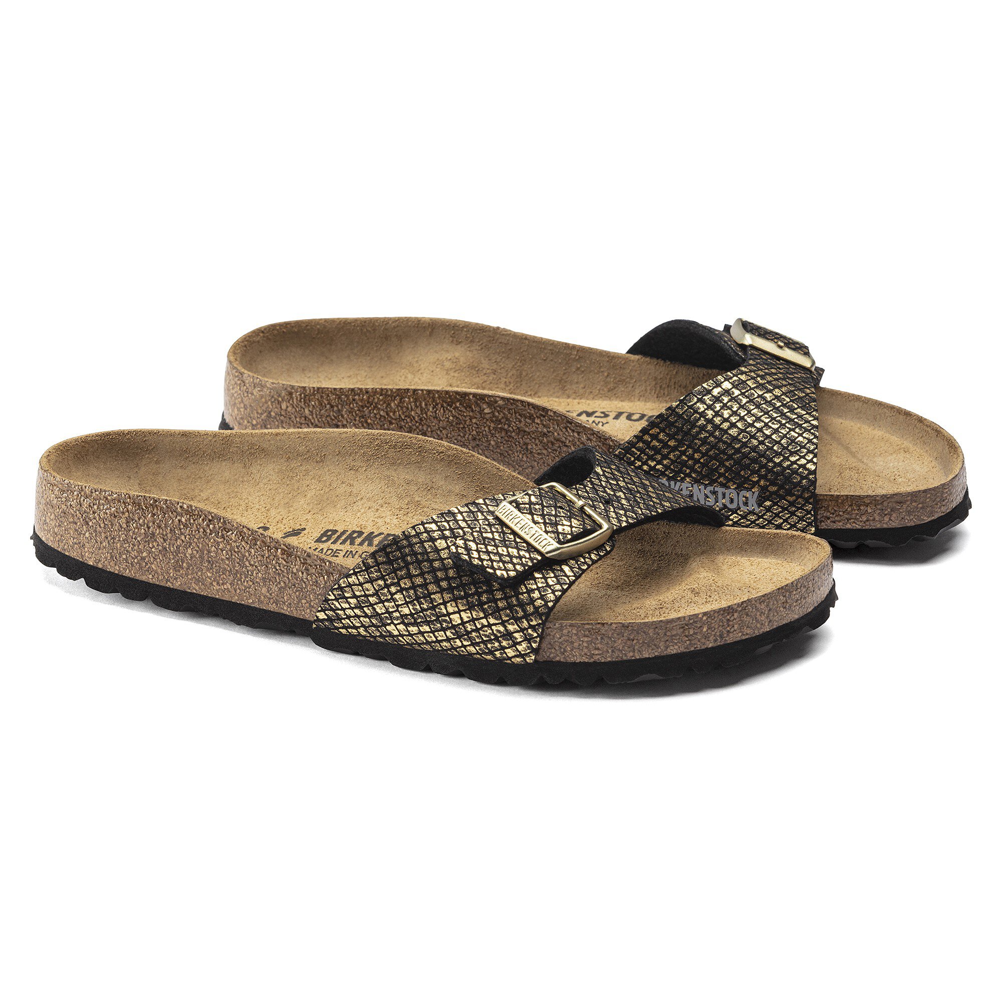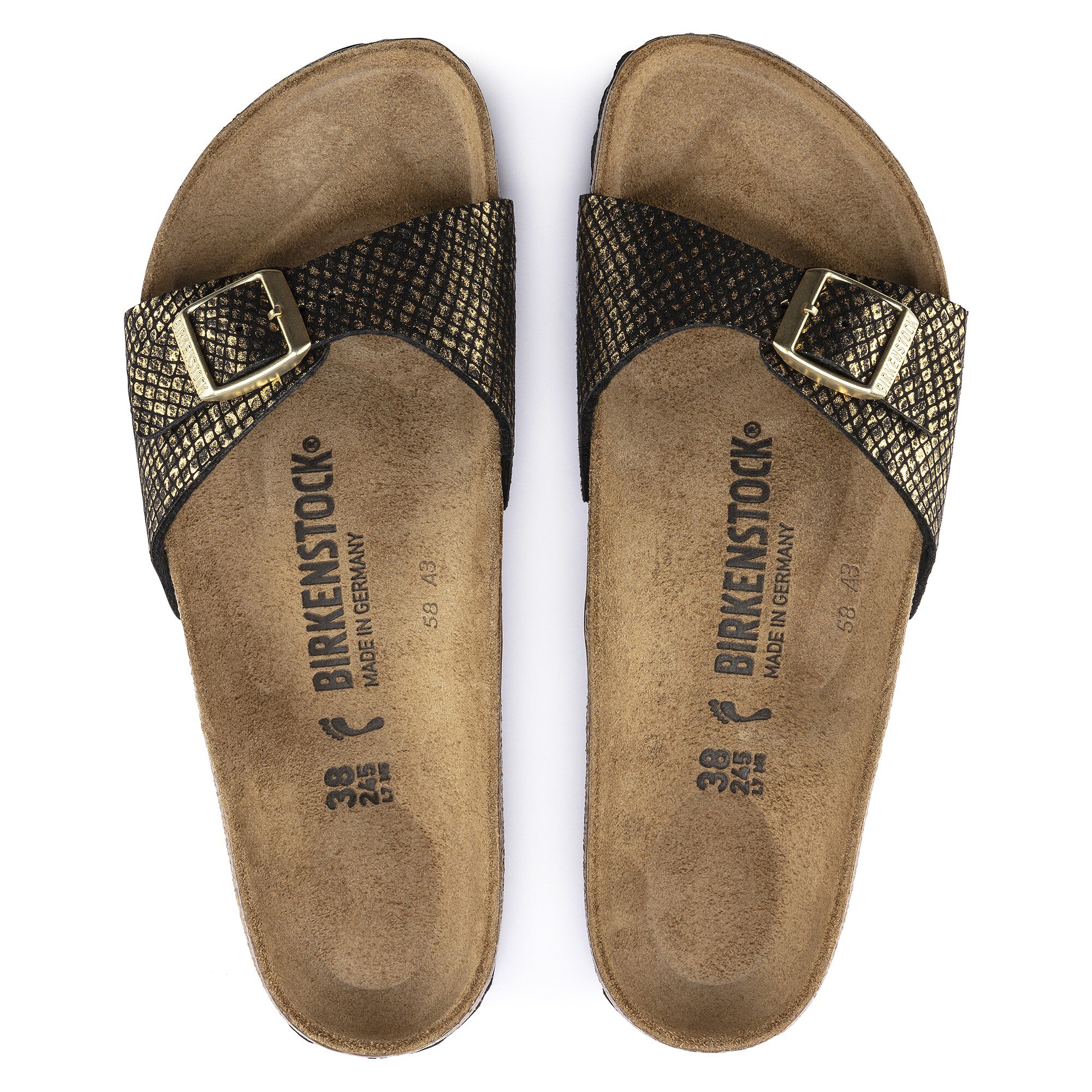 ビルケンシュトック Madrid/マドリッドはそのピュリスティックなデザインでファッション界から絶賛を受け続けてきた真の定番です。上品なパイソンパターンのエンボス加工がこのサンダルの個性を引き立てています。控えめなメタリック効果でグラマラスなアピアランスをお楽しみください。自然をイメージしたこの一足では、どのペアを手に取っても、アピアランスやタッチが同じものはありません。アッパーには肌に優しマイクロファイバーを使用しています。