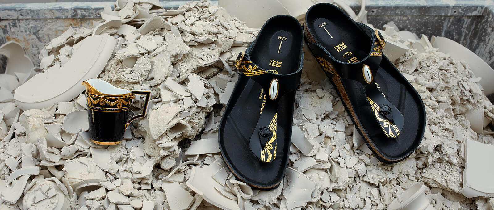 2018 sees a momentous encounter between two unique names. BIRKENSTOCK, synonymous with supreme foot comfort, will debut a limited edition collection with Königliche Porzellan-Manufaktur Berlin – the Royal Porcelain Manufactory Berlin, home of exquisitely hand-crafted porcelain since 1763. The quality of KPM’s porcelain is so enduring that BIRKENSTOCK chose to embellish two of its most popular sandal styles, Arizona and Gizeh, with exclusive porcelain ornaments from the Berlin manufactory.