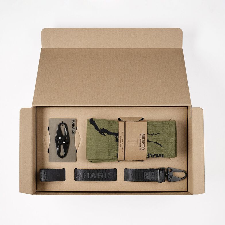 革新的なMogami Terra Techシューズ、快適な“足袋”スポーツソックス、カラビナ、キャリーストラップを組み合わせたBIKRENSTOCK x Maharishiのアウトドアパック。キャリーストラップを使用し、靴を腰に引っ掛けたり、カラビナでバックパックに取り付けることができます。アウトドア派のためにセレクトした必需品をパックとしてまとめました。