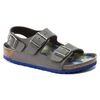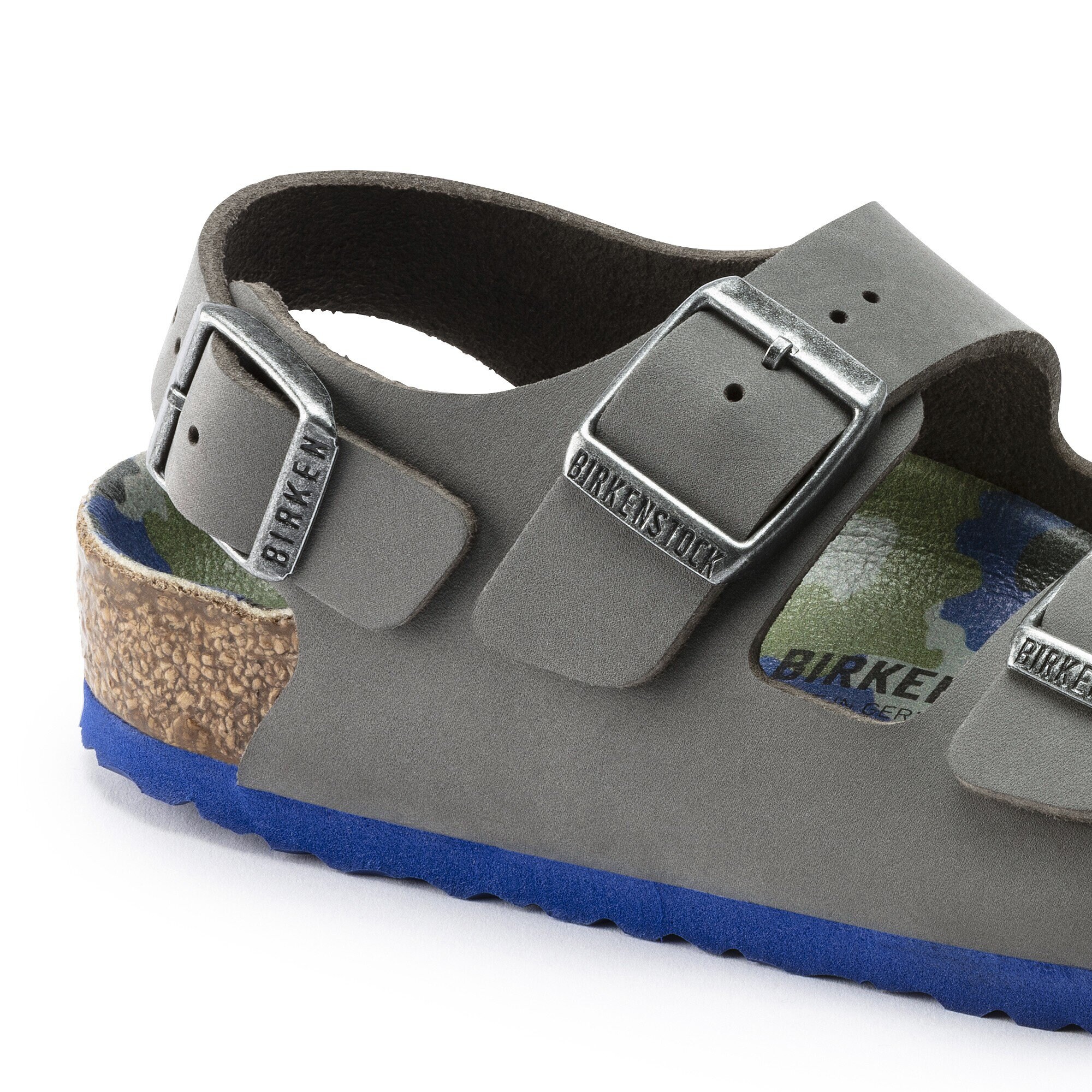 確実なホールド感、安定感、フィット感!バックストラップをあしらったコンパクトなデザインのBIRKENSTOCK Milanoは、腕白に走り回るお子様にもそんな約束ができる一足です。今回このモデルが斬新なカモフラージュプリントのフットベッドで登場します。カラーコントラストを効かせたアウターソールでアピアランスもきれいにまとまっています。アッパーには肌に優しく耐久性の高い合成素材Birko-Flor®を使用しています。