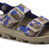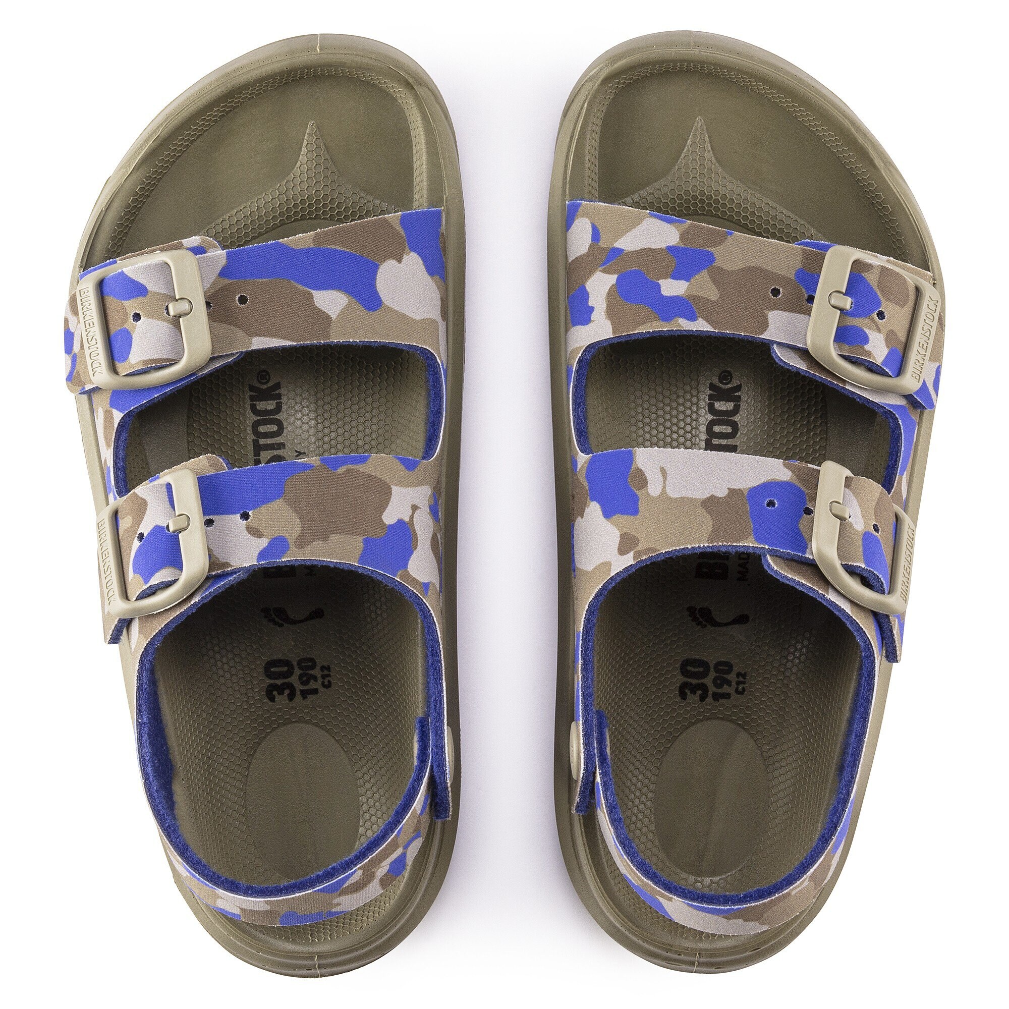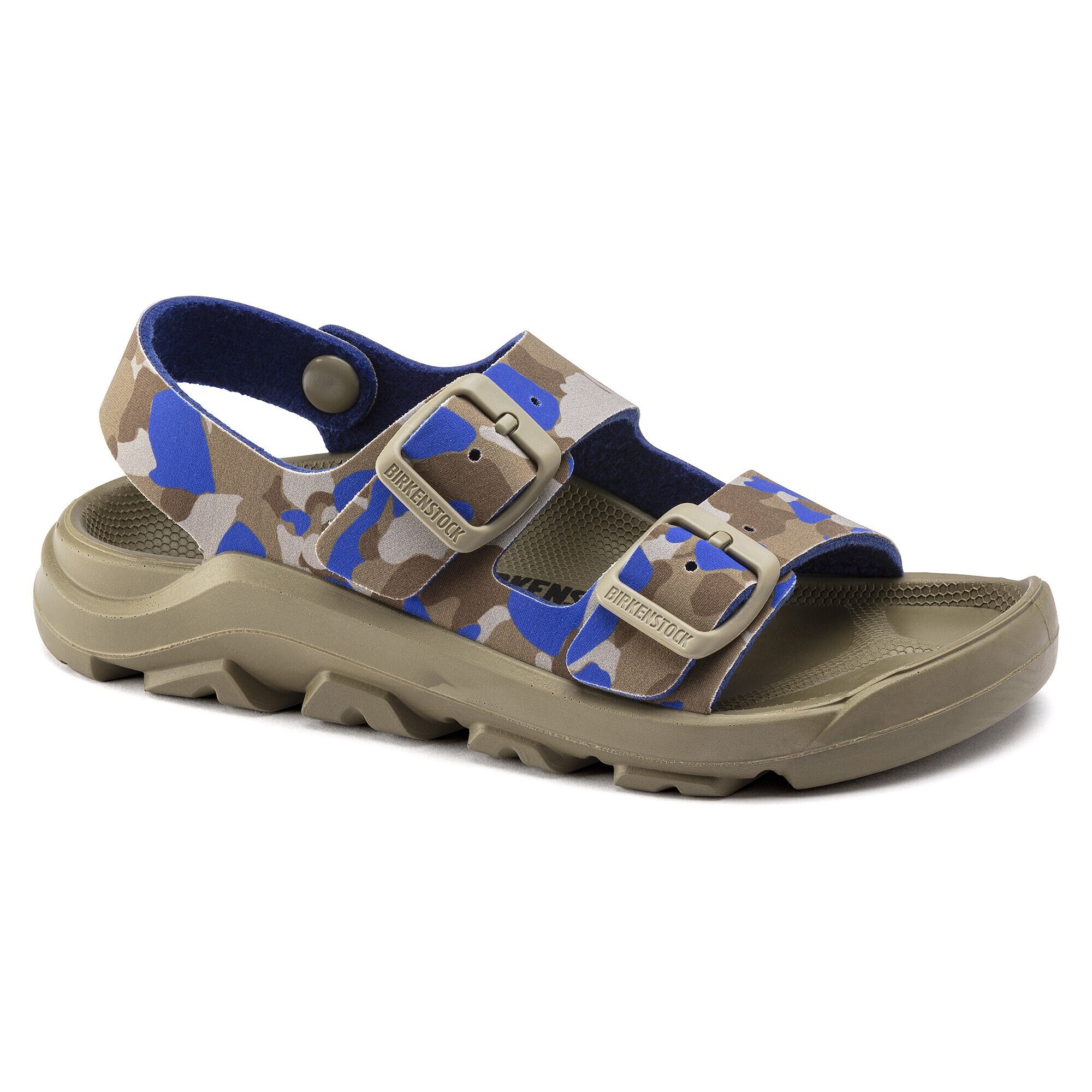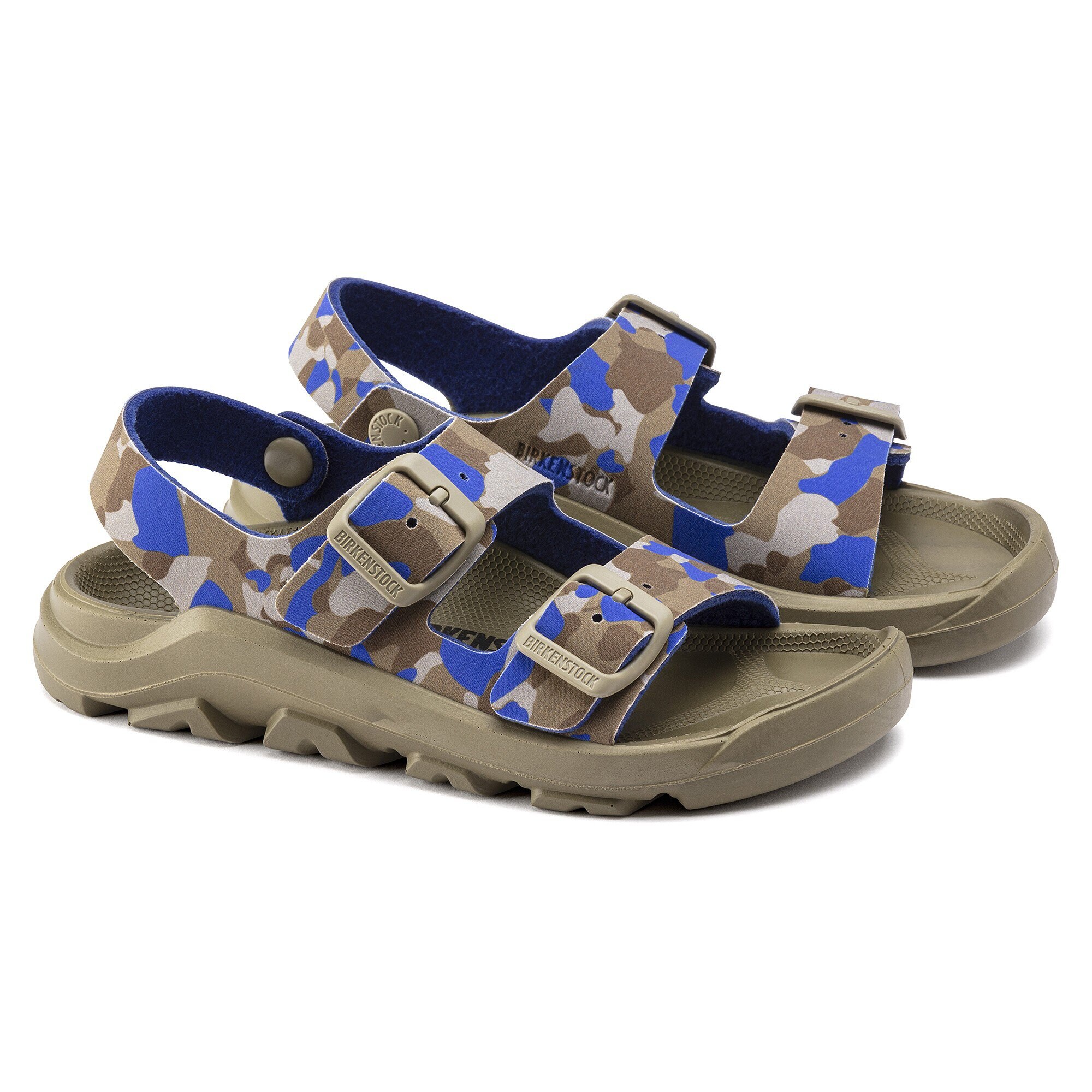 公園で、森で、野原で、そしてぬかるみでも安心のサンダル。BIRKENSTOCK Mogamiはお子様の毎日の大冒険をお供する頼もしい味方です。つま先保護を採用した水にも強いフットベッドと、フットベッドとアッパー素材に2層で発泡成形されているアウターソールがしっかりとお子様の足を守ります。どんな場所でも、柔軟性に富み、しっかり頑丈で長持ちしてくれる嬉しい一足です。今回、ビビッドなカラーを使ったカモフラージュのニューデザインで登場です。アッパーには肌に優しく耐久性の高い合成素材Birko-Flor®を使用しています。