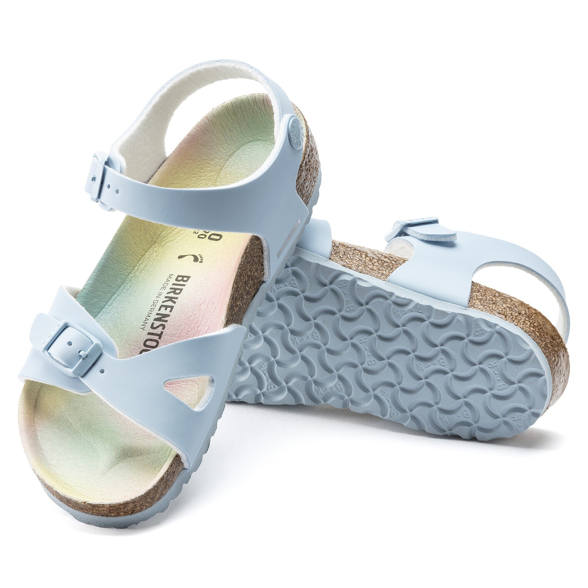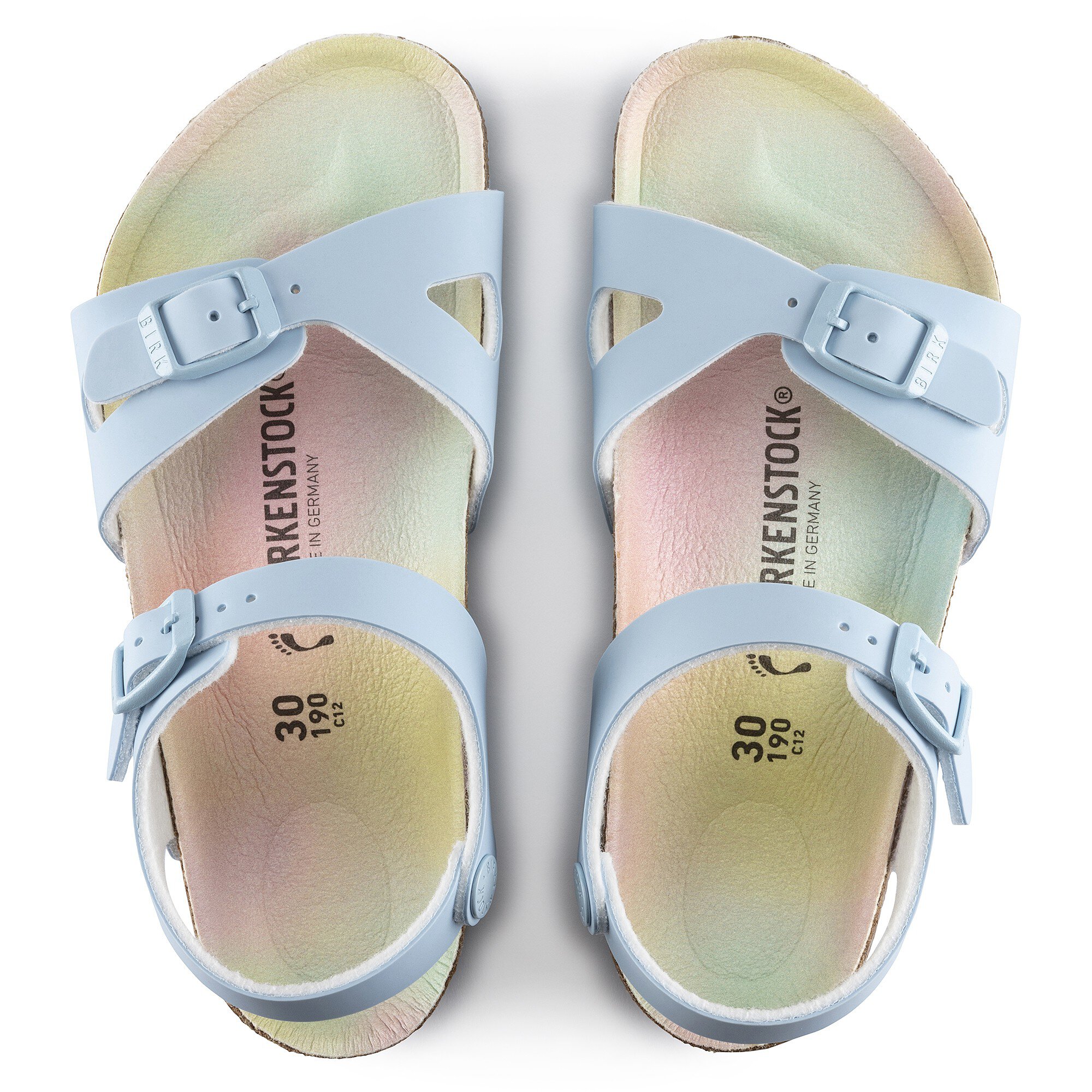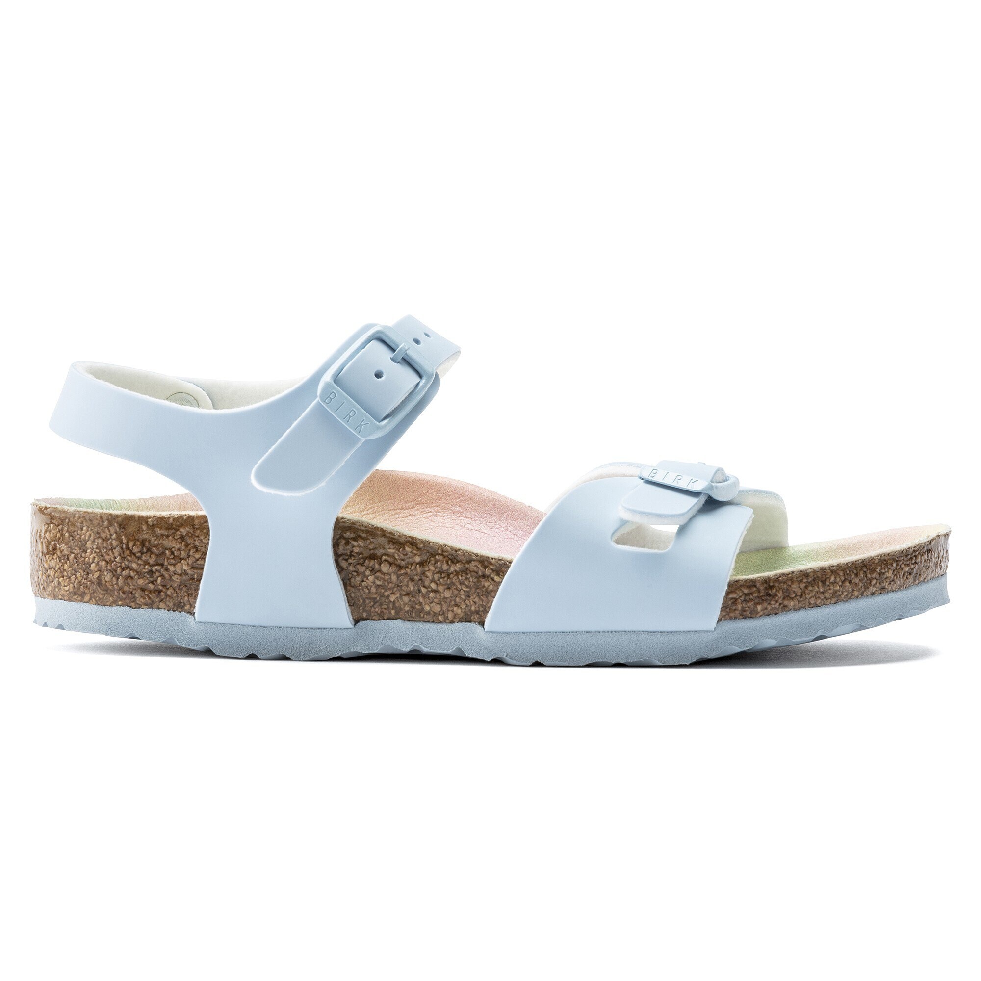 バックストラップが嬉しいBIRKENSTOCK Rioは、アクティブな足のためのエレガントな一足です。このバックストラップが元気に走り回るお子様の足に、安心のホールド感を約束します。フットベッドには虹色に光を放つ特殊フィルムが使用されています。カラーコーディネートされたディテールでアピアランスもきれいにまとまっています。アッパーには肌に優しく耐久性の高い合成素材Birko-Flor®を使用しています。