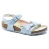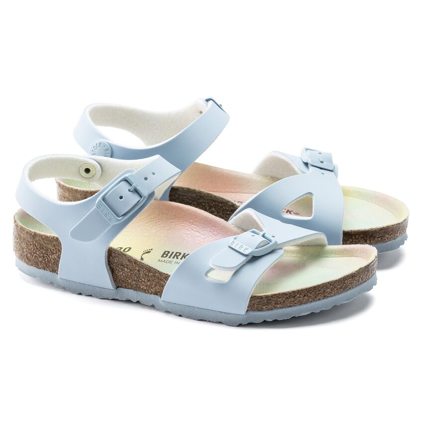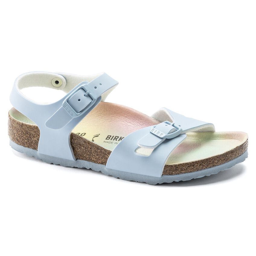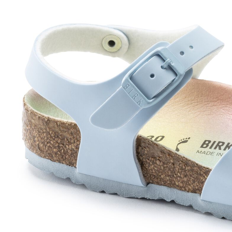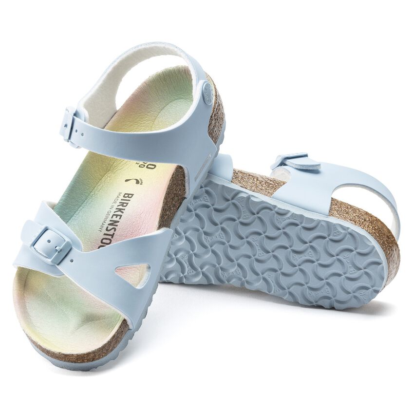 バックストラップが嬉しいBIRKENSTOCK Rioは、アクティブな足のためのエレガントな一足です。このバックストラップが元気に走り回るお子様の足に、安心のホールド感を約束します。フットベッドには虹色に光を放つ特殊フィルムが使用されています。カラーコーディネートされたディテールでアピアランスもきれいにまとまっています。アッパーには肌に優しく耐久性の高い合成素材Birko-Flor®を使用しています。