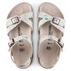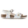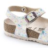 バックストラップが嬉しいBIRKENSTOCK Rioは、アクティブな足のためのエレガントな一足です。このバックストラップが元気に走り回るお子様の足に、安心のホールド感を約束します。今回、茶目っ気のある花柄で登場です。クリエイティブに製作されているこのモデル、野原の花のようにどのペアを手に取っても同じものはありません。カラーコーディネートされたディテールでアピアランスもきれいにまとまっています。アッパーには肌に優しく耐久性の高い合成素材Birko-Flor®を使用しています。