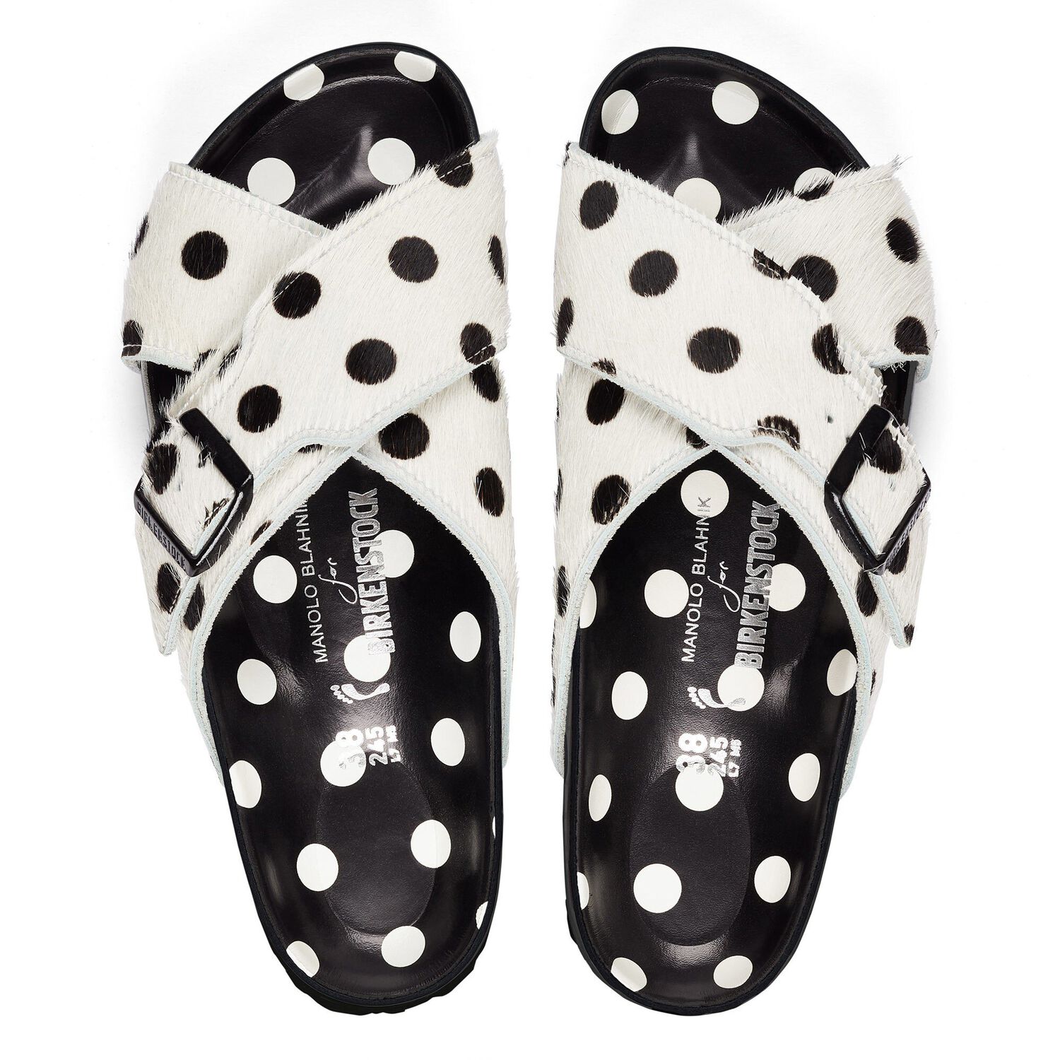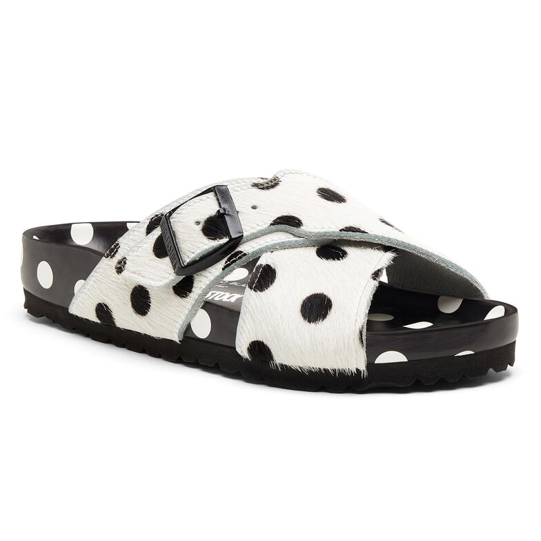 アッパー:白いポニーのようなカーフヘアに黒い水玉模様、ブラックスムースレザー製のストラップのカラーコントラスト