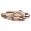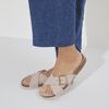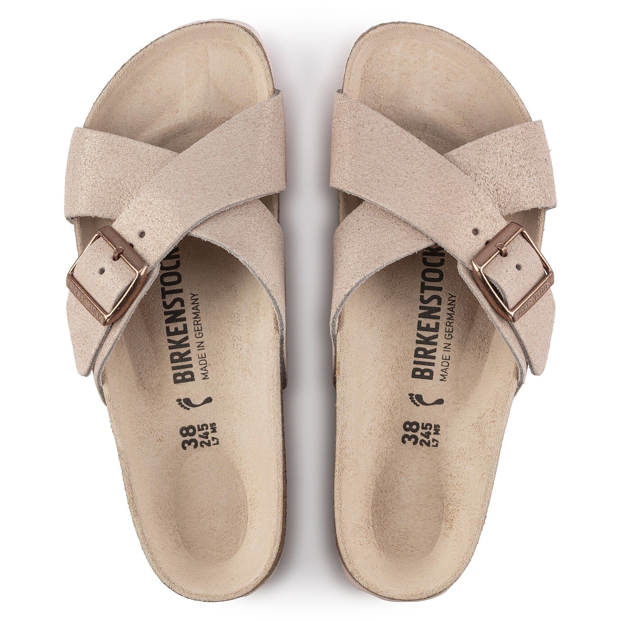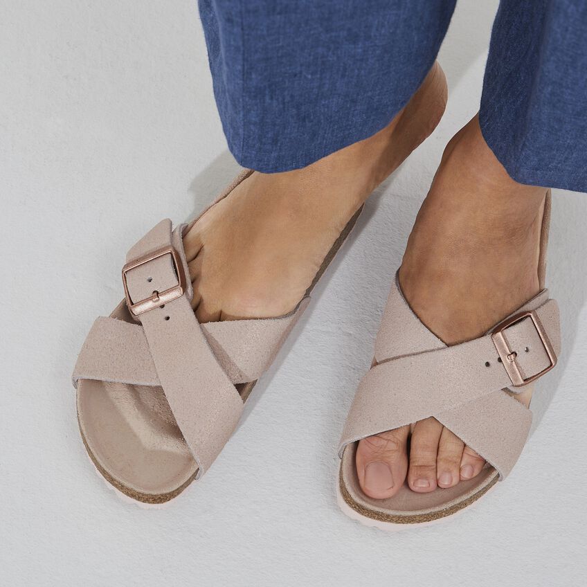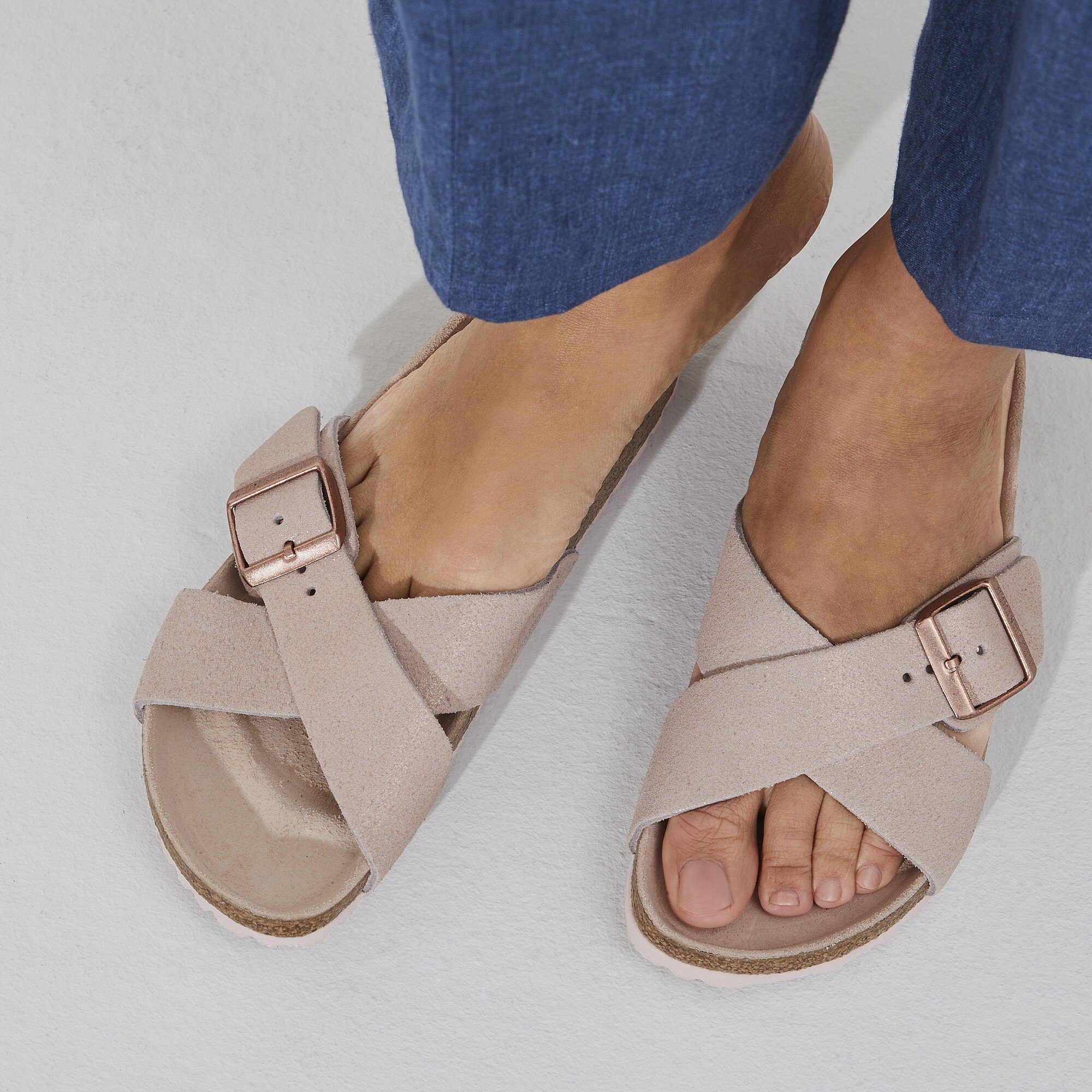 高級感たっぷりのアピアランスが魅力のBIRKENSTOCK Siena。クロスストラップがこのサンダルのユニークなアピアランスを完成させています。今回、光にあたるとキラキラ光る繊細なグリッター加工を施したモデルで登場します。アッパーにはもう一枚の肌のように足を優しく包み込む特に柔らかいベロアレザーを使用しています。