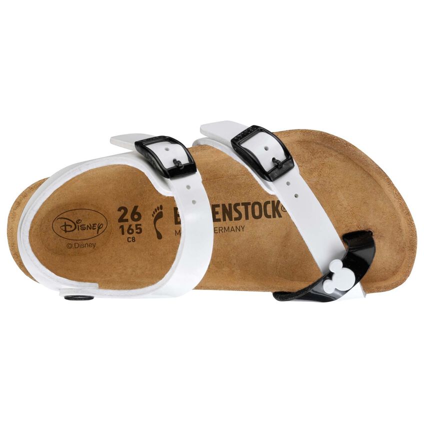 ミッキーマウスで夏を満喫。BIRKENSTOCKサンダTaormina はお洒落な女の子の夏をエレガントに、快適に演出してくれます。足の形状を考慮した天然ゴム混合コルクフットベッドが嬉しい、繊細で透明感のあるこのモデル。ベルトを使って二箇所でフィットを調整することができます。自由にフィット感を調整できる金属製バックルが付いた足首/踵の部分、そして足の甲を支える二本のストラップのおかげで、ぴったりのホールド感をお楽しみいただけます。アッパーに組み込まれている親指ループもこのホールド感に貢献しています。ミッキーもお洒落にデザインされたリベットとしてここに登場します。