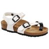 アッパーには肌に優しくお手入れも簡単なBirko-Flor®を使用しています。この摩擦に強い高級素材はトレンディーなエナメル“モノクロ"ルックで仕上げられています。このアッパーは肌に優しくフリースでライニングされ、柔らかく足を包み込みます。軽やかなEVAソールは柔軟性の高いアウターソールです。BIRKENSTOCKならではのアウターソールのボーンパターンは小さい足のために特別に縮小され、心地良い足裏の重心移動を実現します。