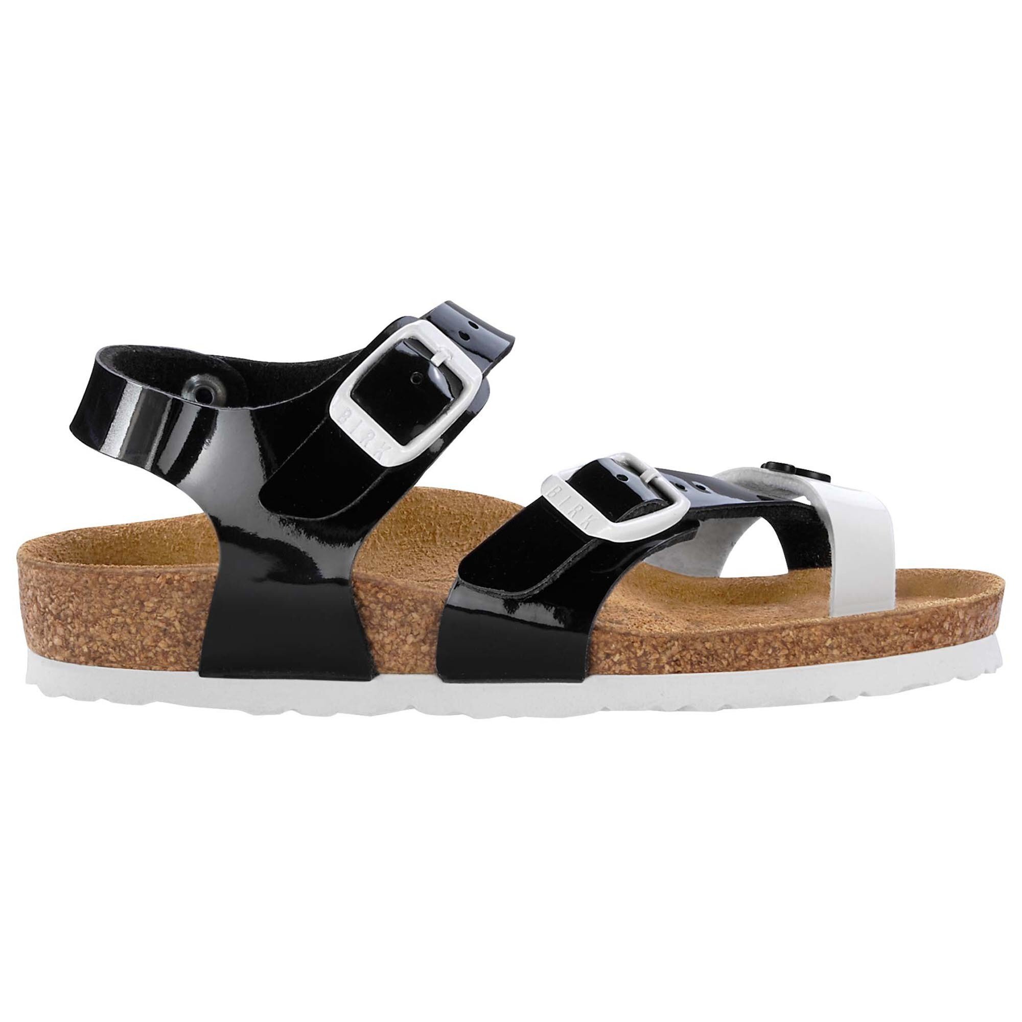 アッパーには肌に優しくお手入れも簡単なBirko-Flor®を使用しています。この摩擦に強い高級素材はトレンディーなエナメル“モノクロ"ルックで仕上げられています。このアッパーは肌に優しくフリースでライニングされ、柔らかく足を包み込みます。軽やかなEVAソールは柔軟性の高いアウターソールです。BIRKENSTOCKならではのアウターソールのボーンパターンは小さい足のために特別に縮小され、心地良い足裏の重心移動を実現します。