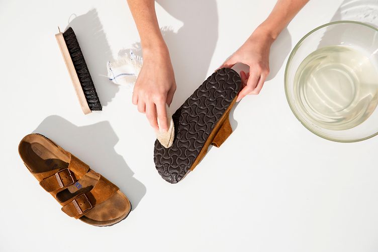 水を固く絞った濡れタオルで泡をふき取ります。サンダルは流水の下に置かないように注意してください。