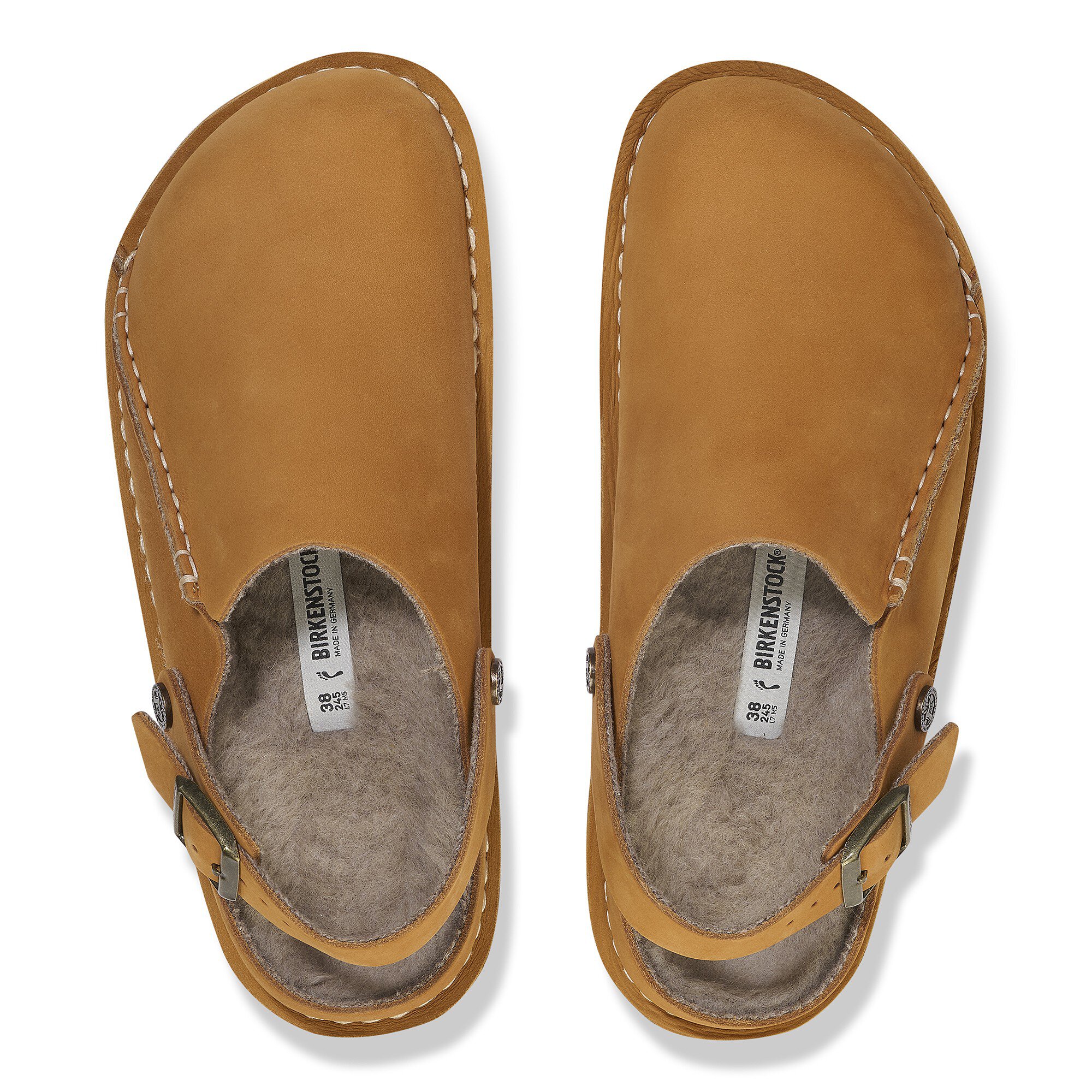 버켄스탁 루트리는 유연한 발목 스트랩 덕분에 백스트랩 스타일이나 오픈 클로그 스타일로 신을 수 있는 슬리퍼입니다. 풋베드를 탈착할 수 있어 세 가지 풋베드 버전 중에서 선택할 수 있습니다. 이 클래식 모델은 "해피 램" 안감이 있는 특히 포근한 버전으로 나왔으며, 시어링 대신 새 양모로 제작되었습니다. 갑피는 버켄스탁을 위해 특별히 개발된 소재인 버키울로, 고급 누벅 가죽과 부드러운 양모 안감으로 구성되어 있습니다.
