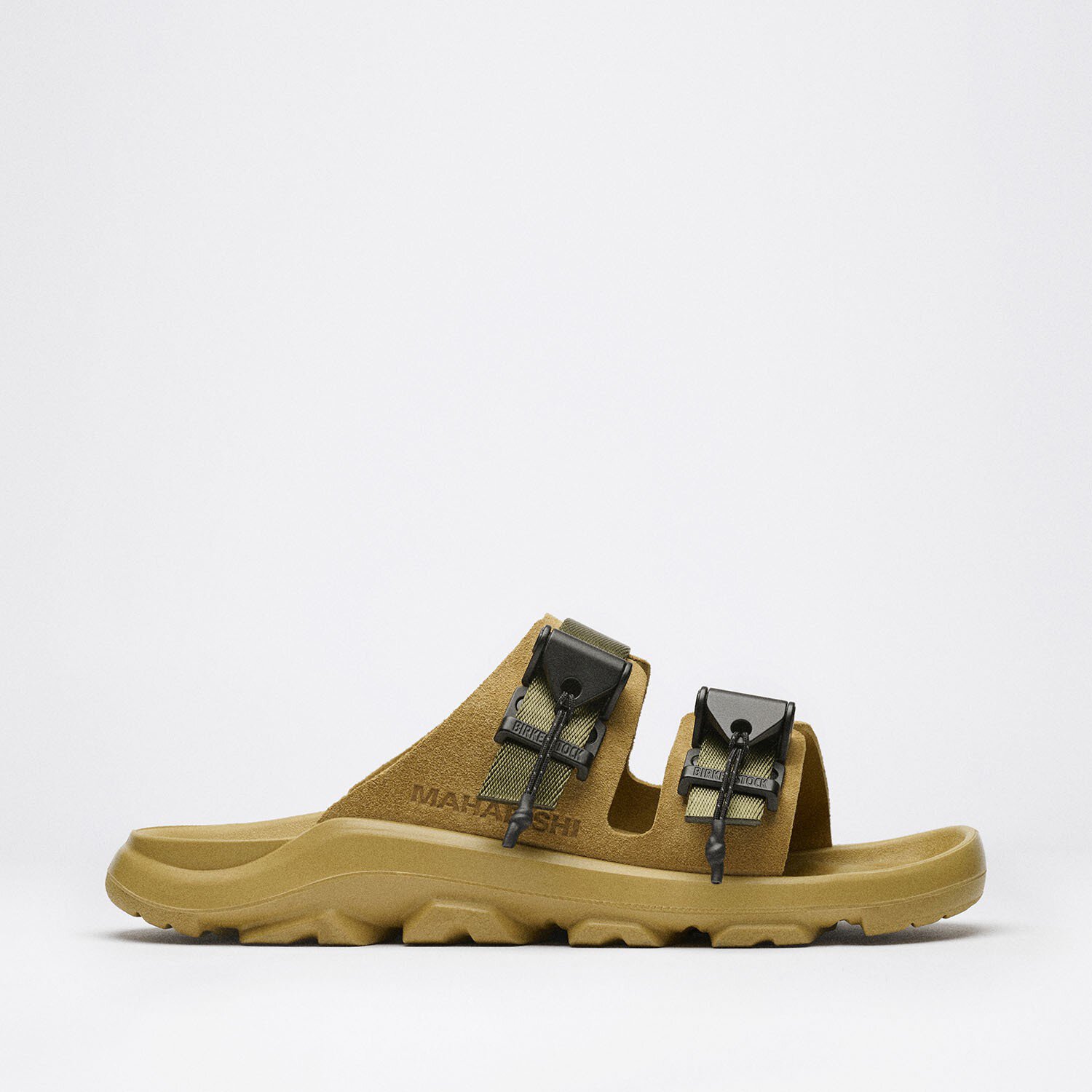 BIRKENSTOCK과 마하리시는 탁월한 착화감을 선사하기 위해 야외 활동을 위해 적응성을 갖춘 Mogami Terra Tech를 활용하였습니다. 두 개의 스트랩은 고급 스웨이드와 광택 웨빙 소재로 구성되어 있으며, 각 스트랩 중앙에는 고성능 퀵 릴리스 버클이 장착되어 있습니다. 하단부에는 BIRKENSTOCK 특유의 해부학적 풋베드를 방수 버전으로 구현한 폴리우레탄(PU) 밑창이 접지력과 보호 기능을 제공합니다.