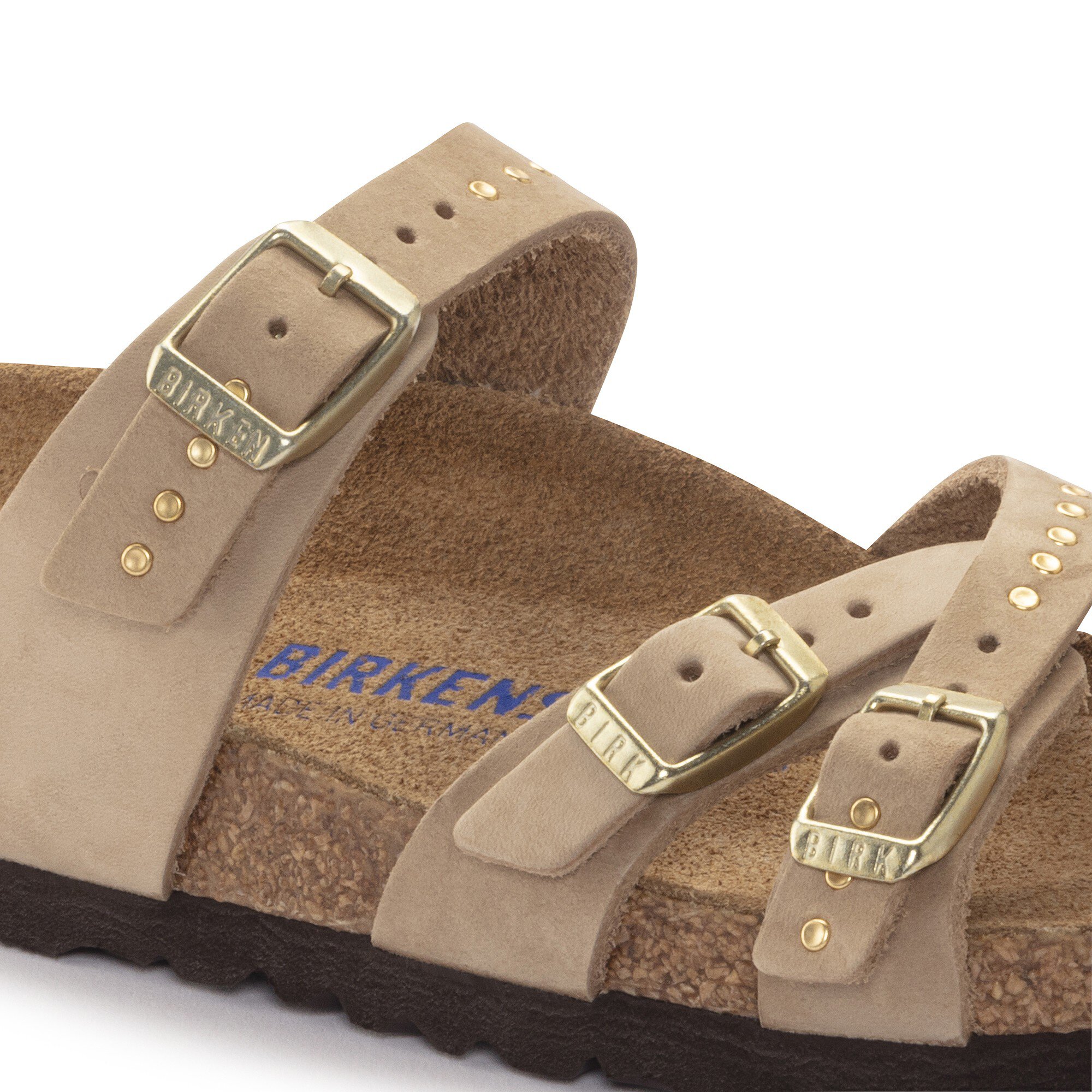يعدُّ صندل فرنكا من بيركنستوك صندلاً خفيفًا بأشرطة متقاطعة رفيعة. يتميز هذا الإصدار بمسامير موضوعة بدقة بدون رأس، ومصنوعة لتستقر بثبات في الجلد، في إطار عملية متقنة بدون أن تتعمق كثيرًا، ما يجعلها غير ملحوظة عند انتعال الحذاء. بفضل الطبقة الإسفنجية الإضافية، يوفر النعل الناعم مزيدًا من الراحة والعناية بالقدمين، طوال اليوم. الجزء العلوي مصنوع من جلد النوبوك الناعم عالي الجودة الذي يتميز بمظهر طبيعي وخشن.