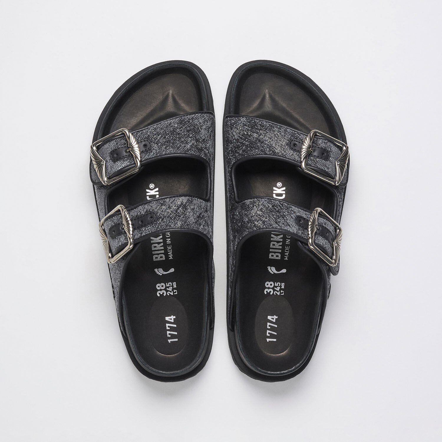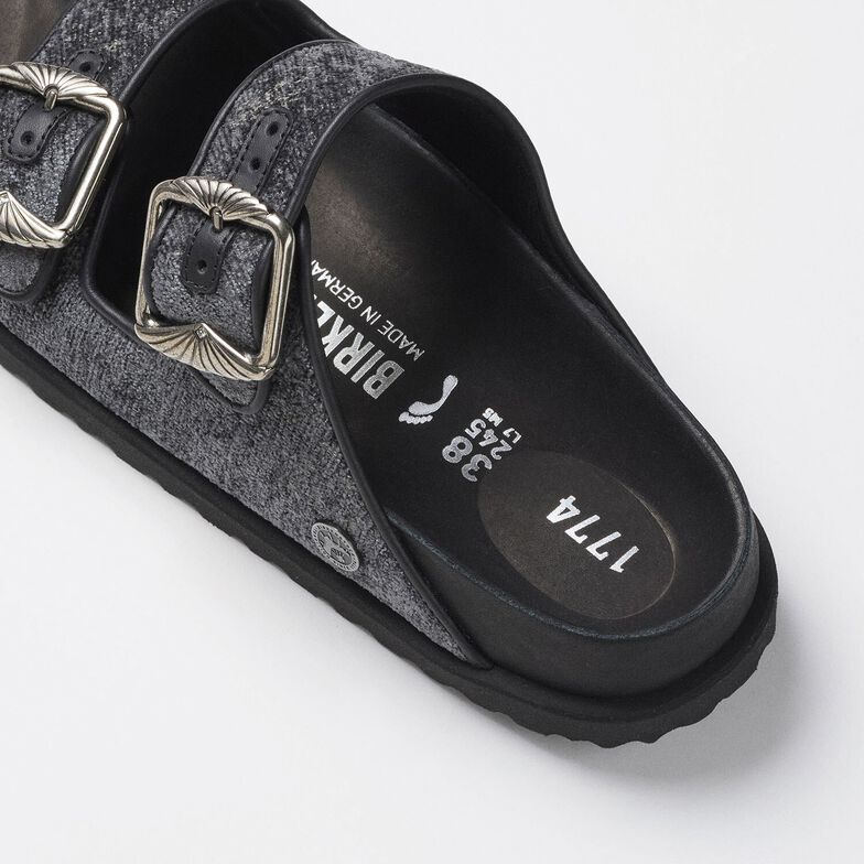 Inspired by the vibrant spirit of 1920s Berlin, this reinterpretation of the classic Arizona introduces a touch of vintage glamour with rich velvet. The luxurious upper, paired with a newly designed Art Deco–inspired buckle, blends modern craftsmanship with historical elegance to capture the bold energy and renewed sense of style that defined the era.