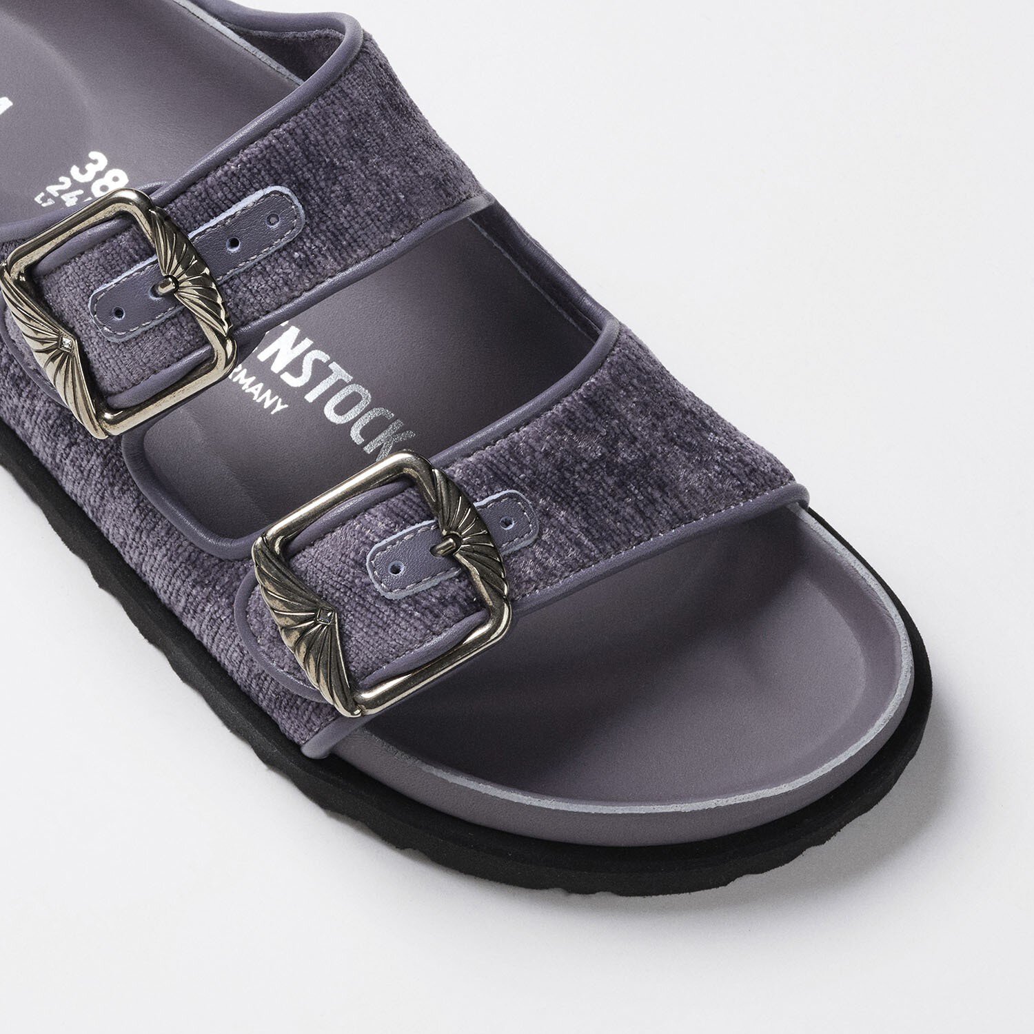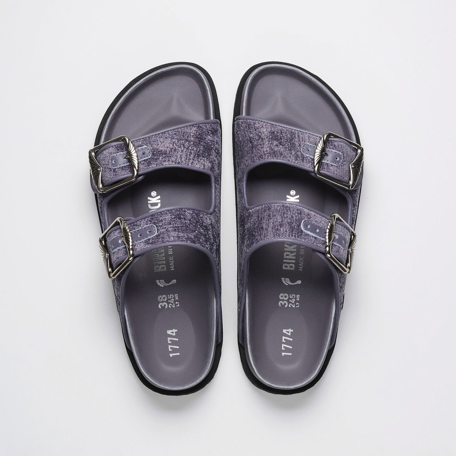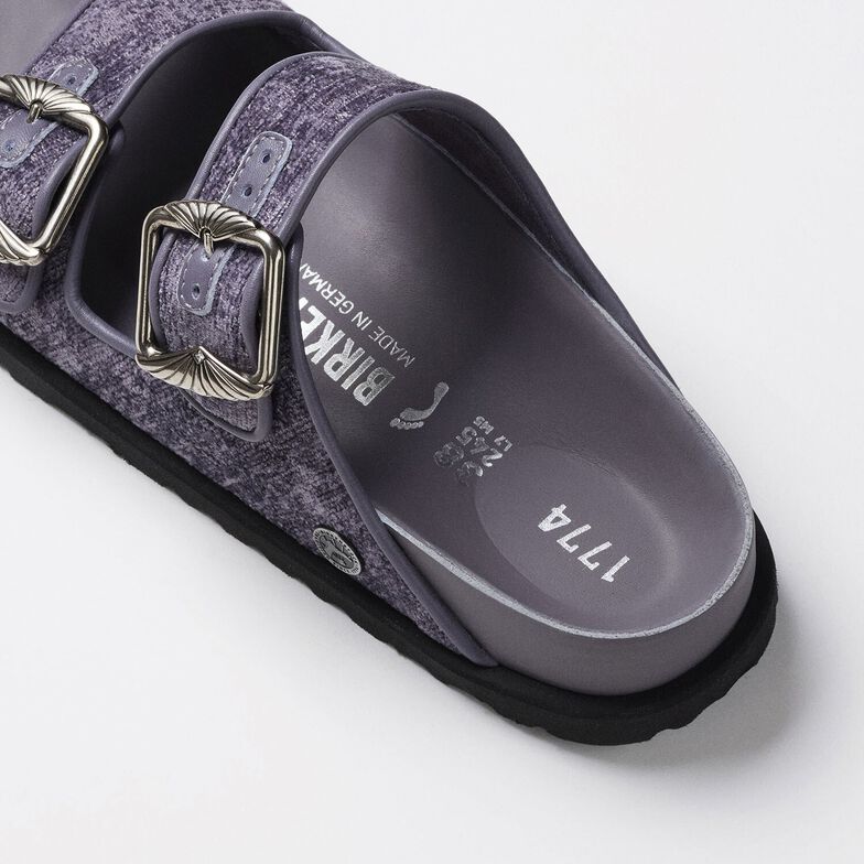 Inspired by the vibrant spirit of 1920s Berlin, this reinterpretation of the classic Arizona introduces a touch of vintage glamour with rich velvet. The luxurious upper, paired with a newly designed Art Deco–inspired buckle, blends modern craftsmanship with historical elegance to capture the bold energy and renewed sense of style that defined the era.