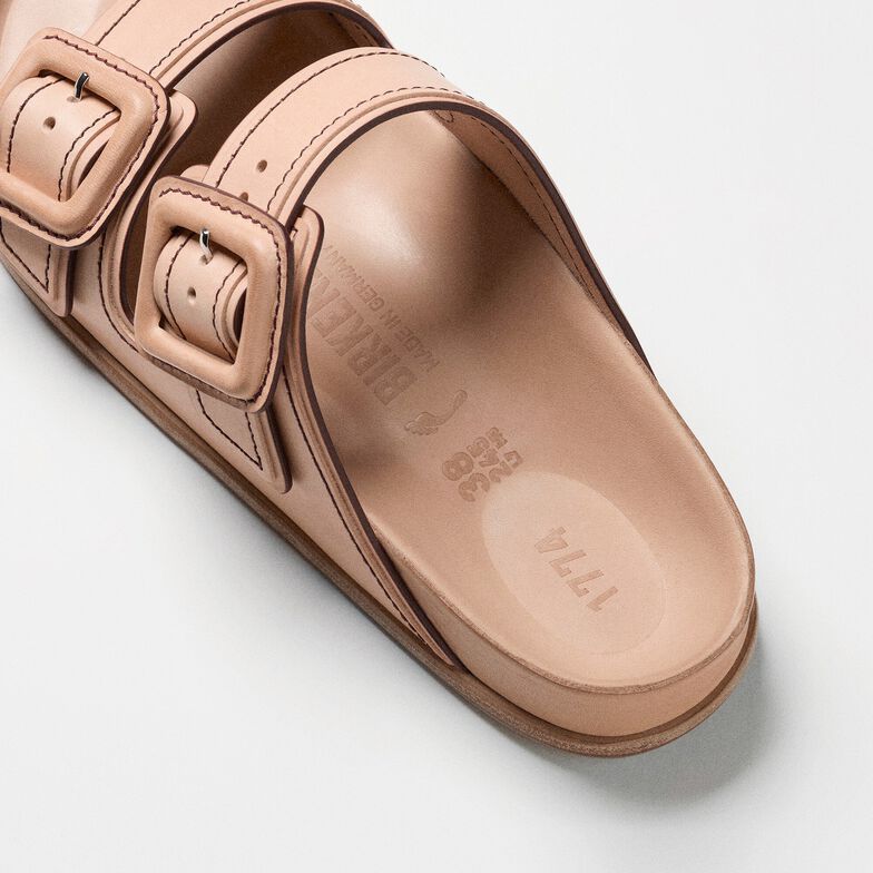 The limited-edition Arizona comes in black and raw beige. Crafted in BIRKENSTOCK’s German factories, the leather is molded over the hardware using heat and humidity for a three-dimensional look. The natural vegetable-tanned leather develops a unique patina over time, telling a personal story with each step.