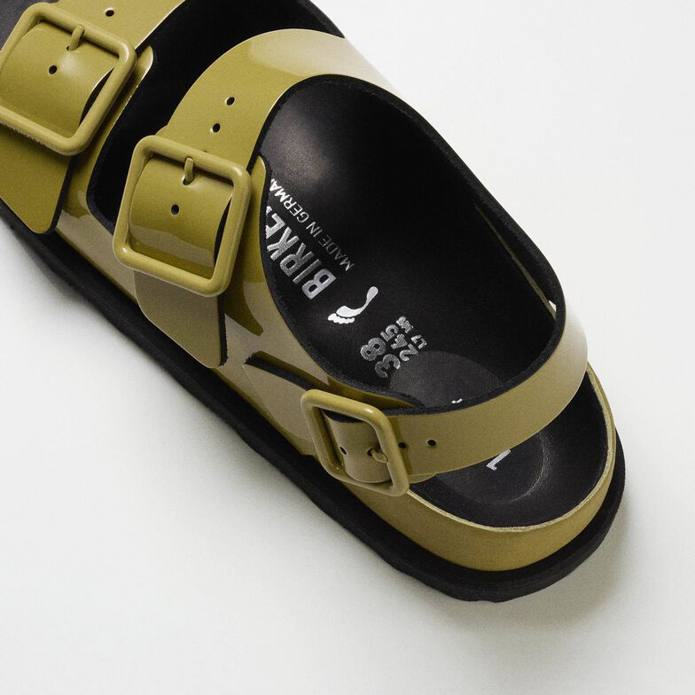 With its eye for refined materials and detail, this new 1774 Collection celebrates the iconic Milano style by creating a design with a luxurious high-shine finish and a smooth patent leather upper. The famous BIRKENSTOCK footbed is wrapped in premium Nappa leather which embodies the feel of luxury and craftmanship.