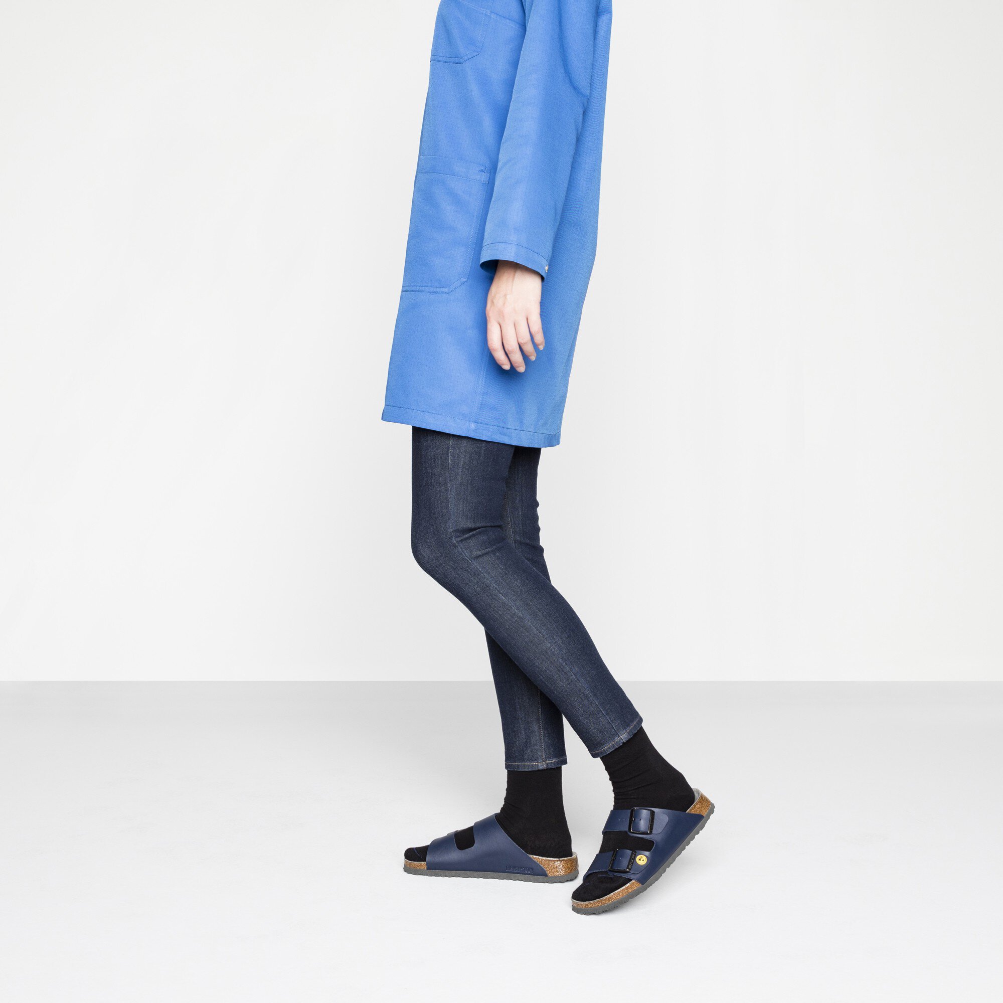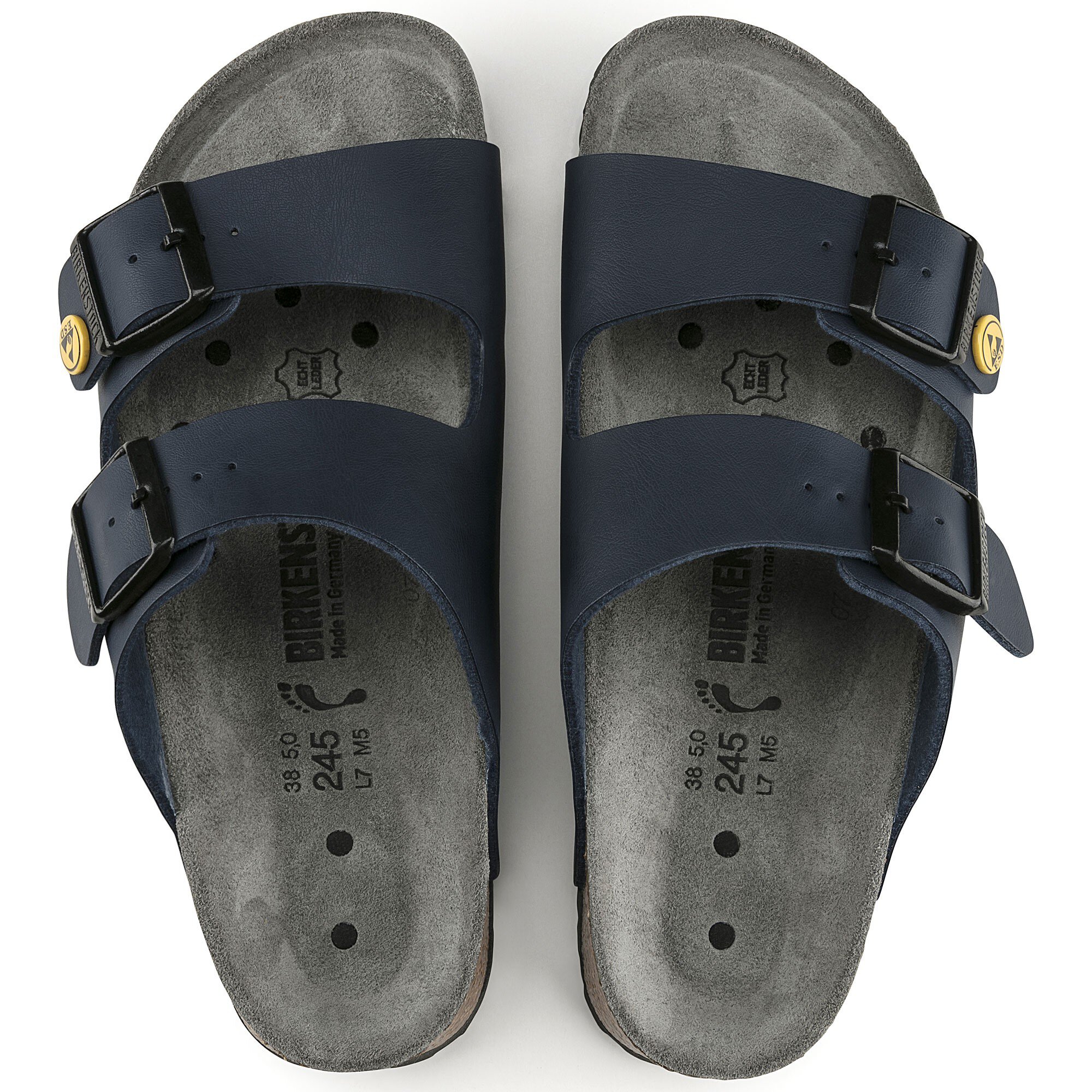 With its high level of comfort and the anatomically shaped original cork-latex footbed, the Arizona two-strap sandal from BIRKENSTOCK lends itself well to daily occupational use. Thanks to its additional ESD properties to combat spontaneous electrostatic discharge, this model is ideal for wearing in ESD areas. The combination of the footbed and the specially developed sole guarantees permanently gentle discharge and protects sensitive parts. All BIRKENSTOCK ESD models are tested in accordance with the requirements of EN 61340 and meet the ESD requirements of 1.0 × 105 to 3.5 × 107 ohms.