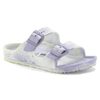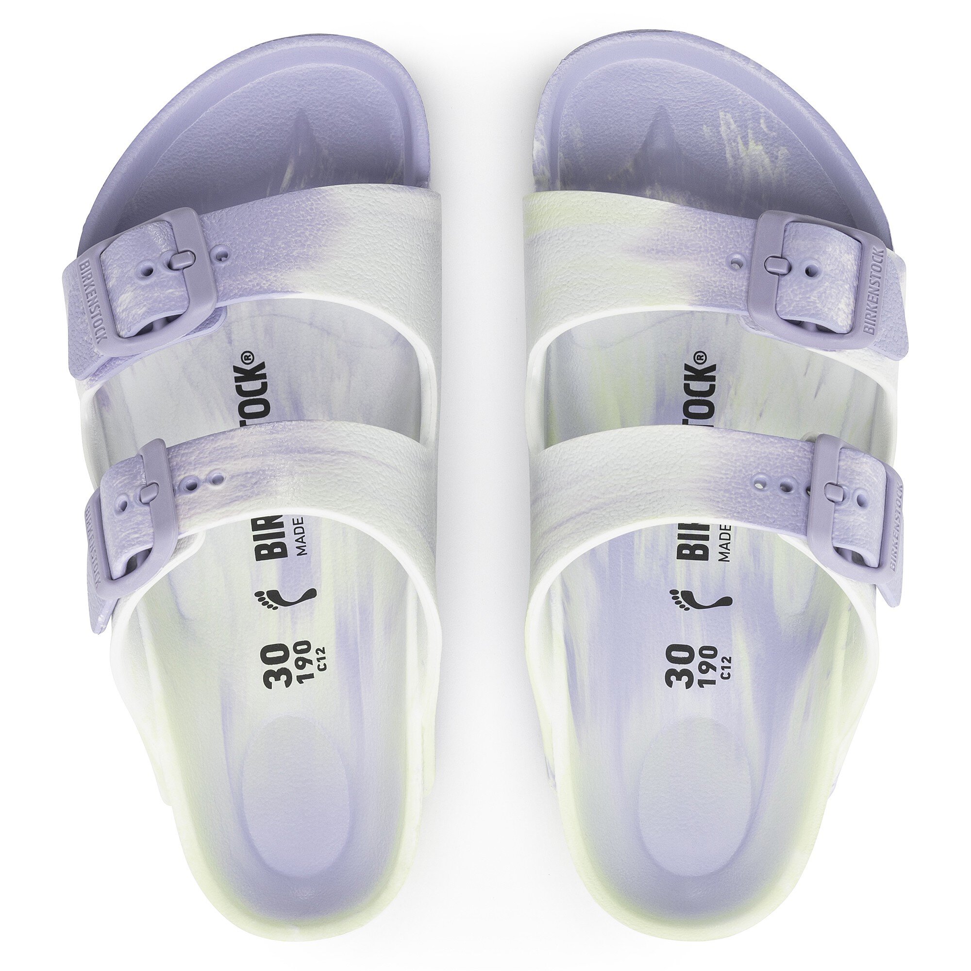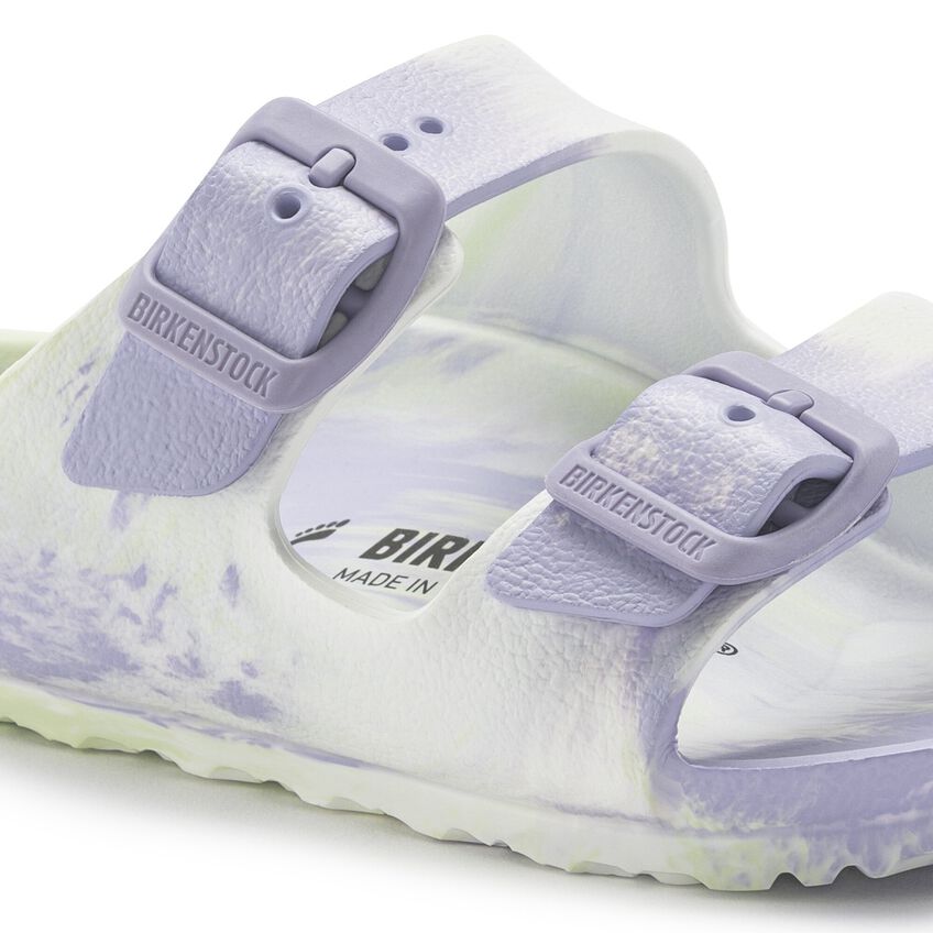 The BIRKENSTOCK Arizona is a genuine classic that has been delighting wearers with its timeless design for decades. The two-strap model fits kids’ feet perfectly – even during boisterous play! Modeled on the cork sandal, this version is made from EVA. The high-quality, odor-neutral EVA has been tested for harmful substances and combines numerous positive attributes. It is ultra lightweight, highly elasticated, waterproof, skin-friendly – and offers the comfort you have come to expect from BIRKENSTOCK. The swirl of colors really catches the eye. Thanks to the creative production process during which EVA particles are heated and then melt, no two pairs are the same. The product and the distribution of colors can thus differ from the photo.