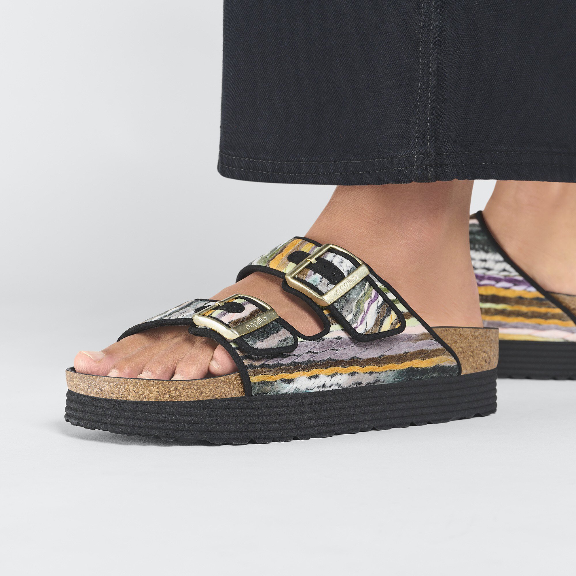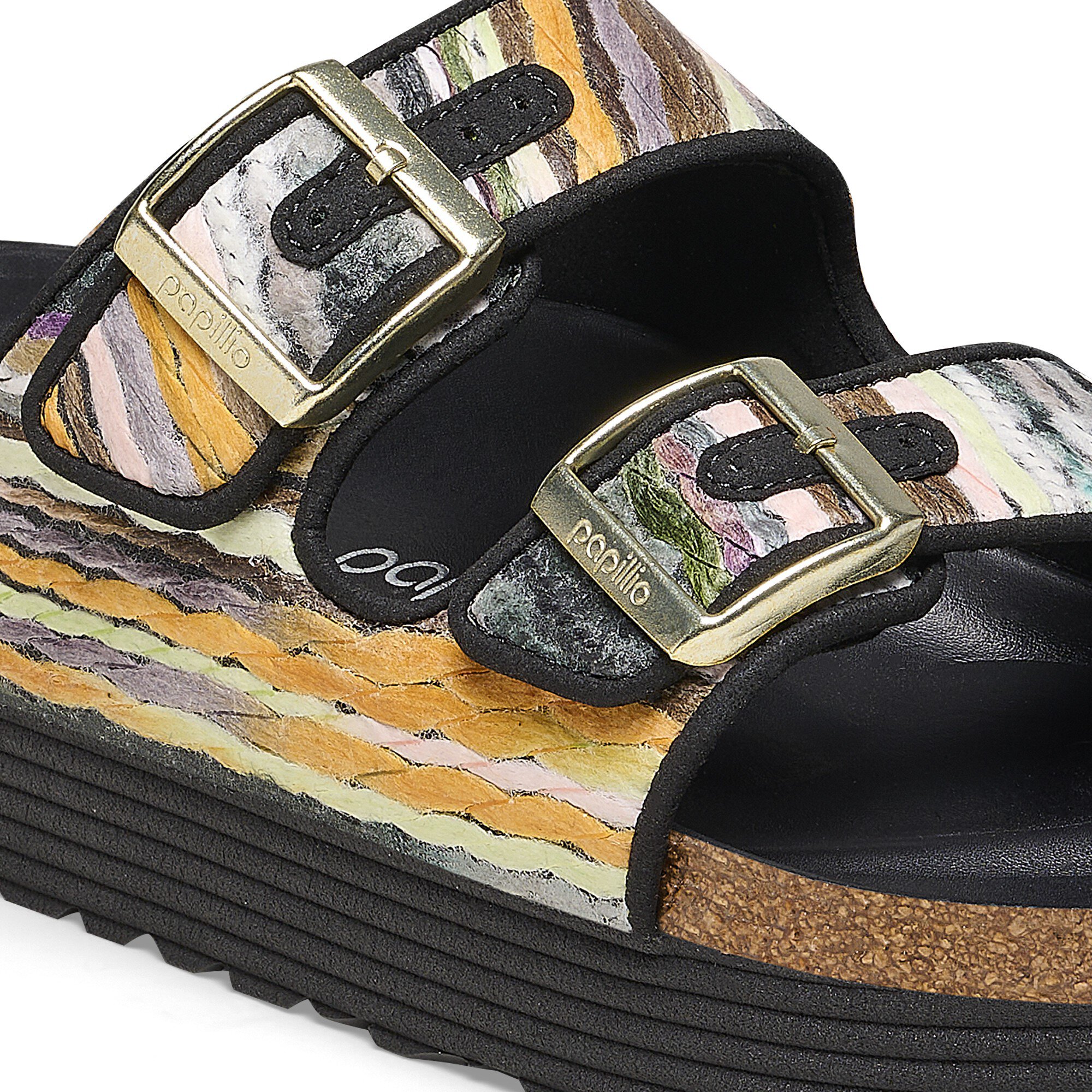 The Arizona is a genuine classic that has been delighting both men and women for decades. Here, Papillio presents the two-strap model with a stylish , grooved platform sole. The bevels at the front and back provide for maximum walking comfort. This version boasts a colorful woolen look reminiscent of woven fabric. The semi-exquisite footbed is fully lined with soft piumato leather, making it exceptionally comfortable. The upper is made from smooth fabric.