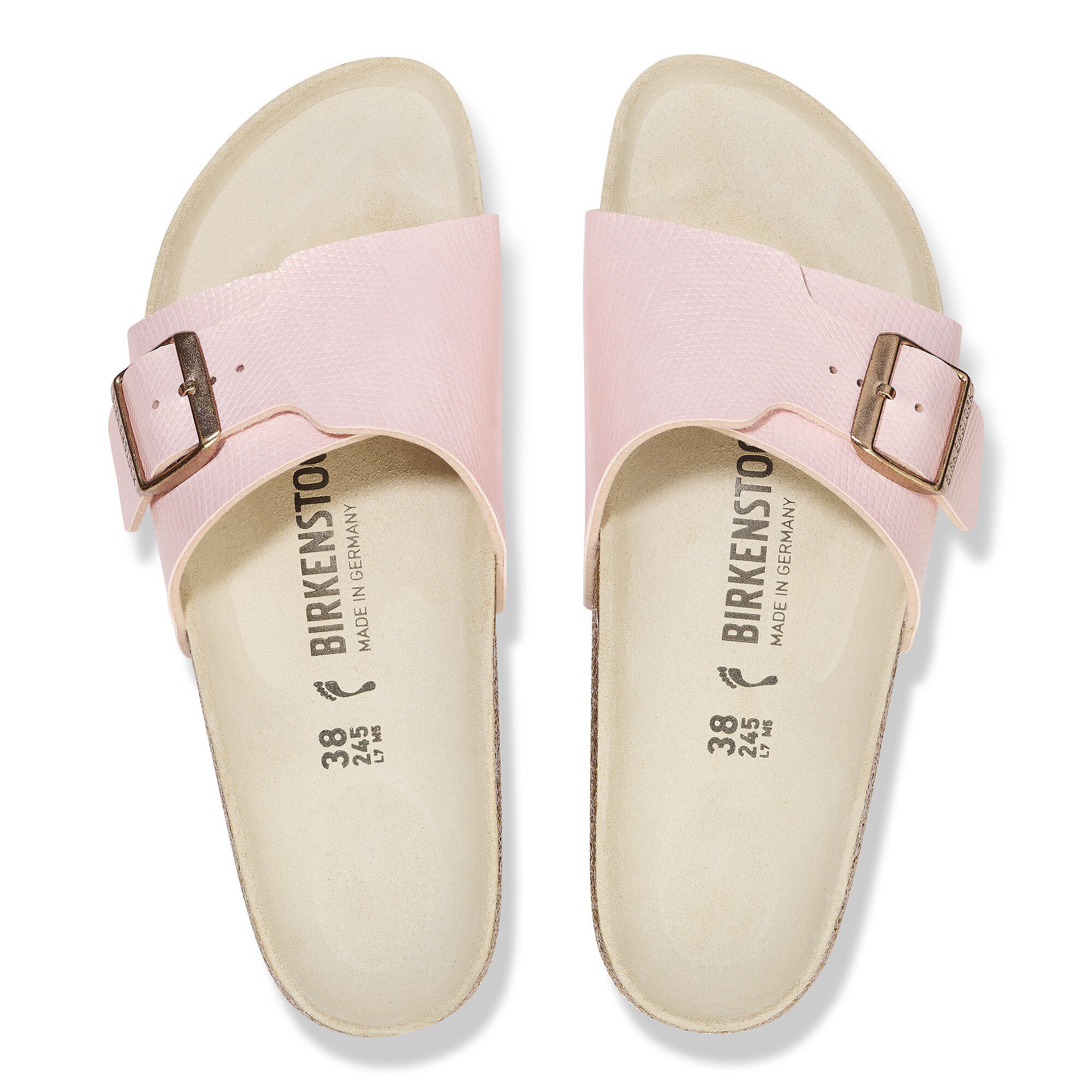 The design of the BIRKENSTOCK Catalina was inspired by the classic Madrid with a strap and metal buckle. The slightly wider strap lends this sandal a modern elegant appearance. This version comes in a shiny lizard design and exudes elegance and a touch of extravagance thanks to the iridescent metallic foil and the reptile skin look. Inspired by nature, no two shoes have the same look and feel. The upper is made from the skin-friendly, hard-wearing synthetic material Birko-Flor®, which has been embossed.