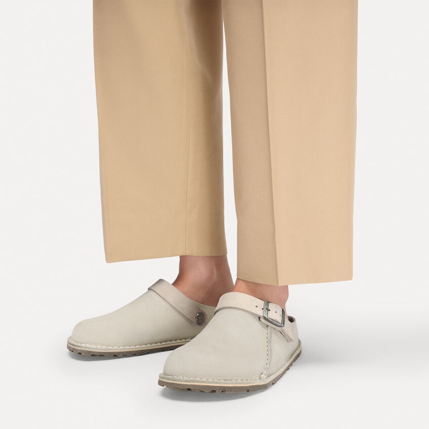 The BIRKENSTOCK Lutry is a slipper that can be worn as a backstrap style or as an open clog thanks to the flexible ankle strap. The footbed can be removed so that you can choose between three different footbed versions. This basic version of this design features our Standard Footbed. It replicates the natural print made by a foot walking on sand and will see you through the day in comfort. Its natural design is down to the upper made from especially soft suede, which hugs the foot like a second skin.