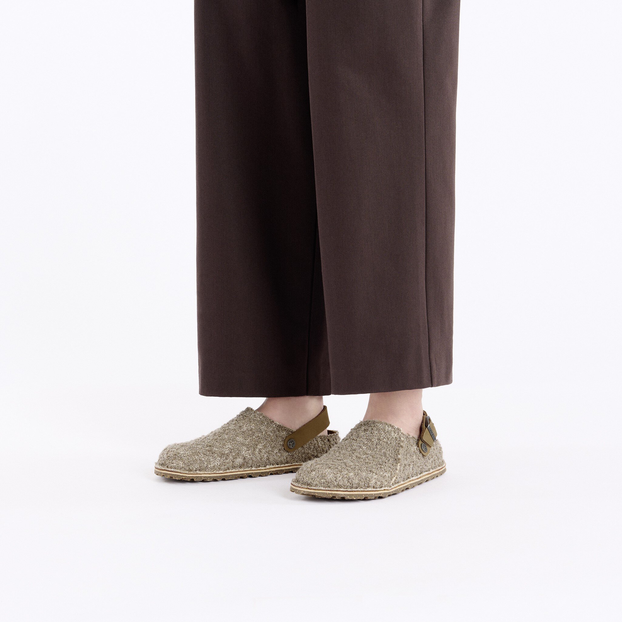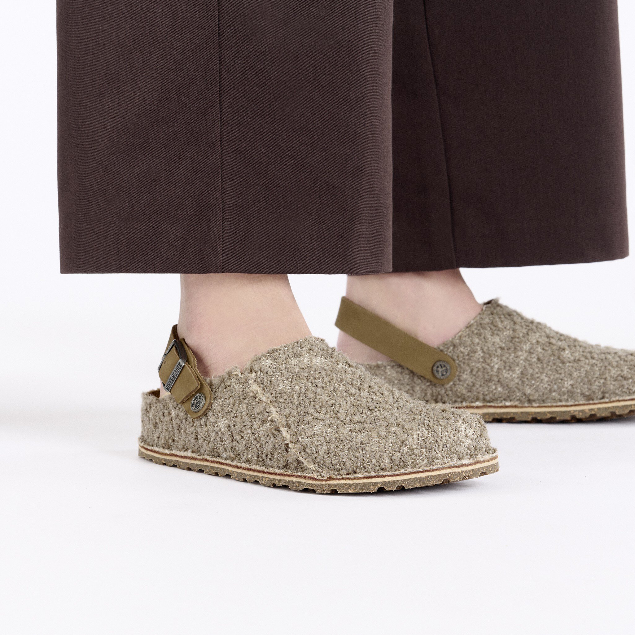 The BIRKENSTOCK Lutry is a slipper that can be worn as a backstrap style or as an open clog thanks to the flexible ankle strap. The footbed can be removed, for you to choose between three different footbed versions. This basic version features our standard footbed. It replicates the natural print made by a foot walking on sand and will see you through the day in comfort. The upper material consists of bouclé inspired by home textiles, which stands out thanks to its soft structure and pleasant feel.