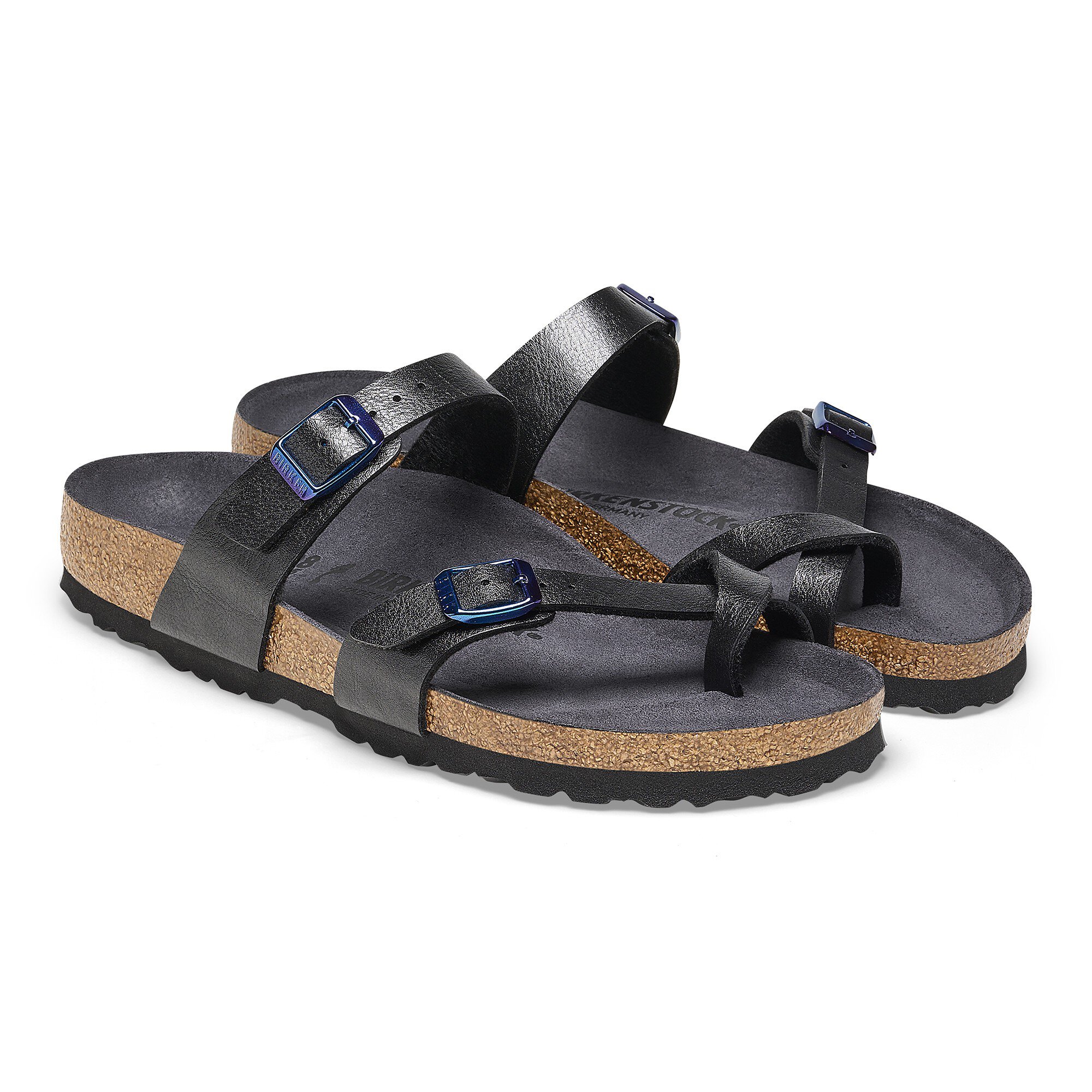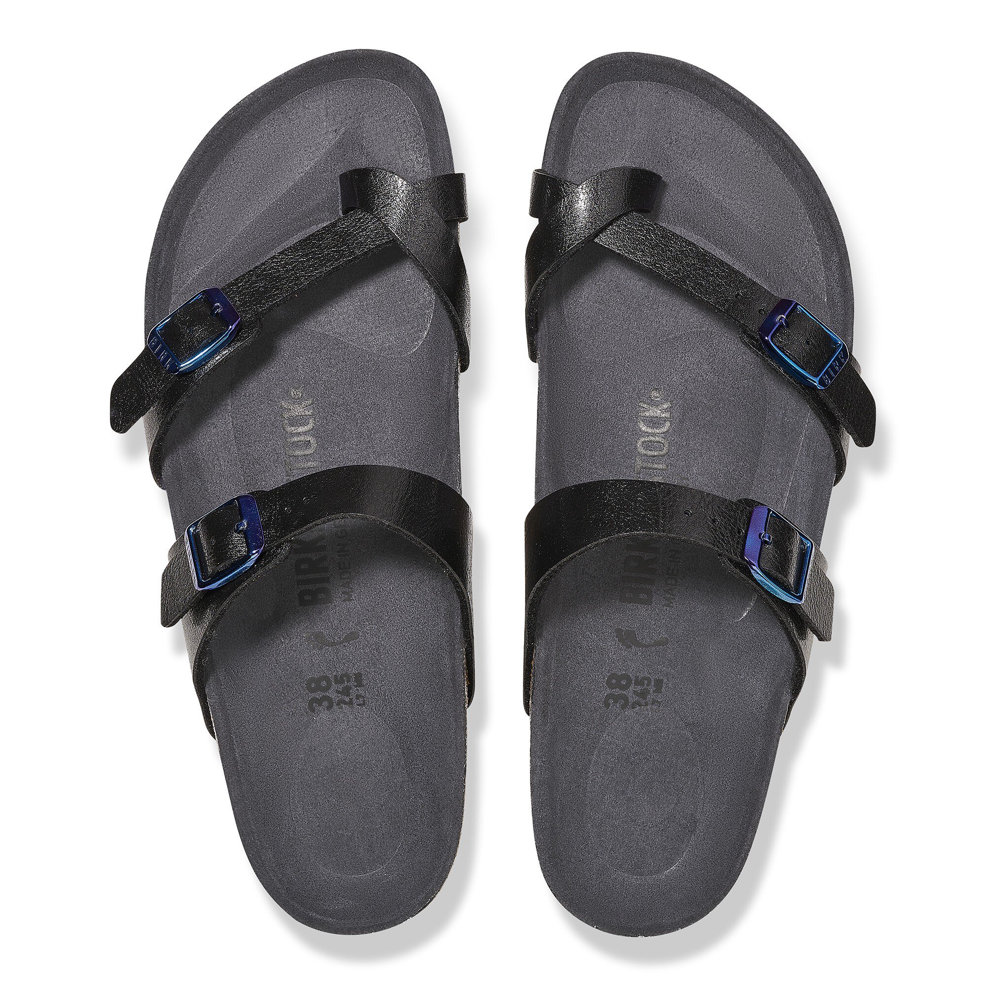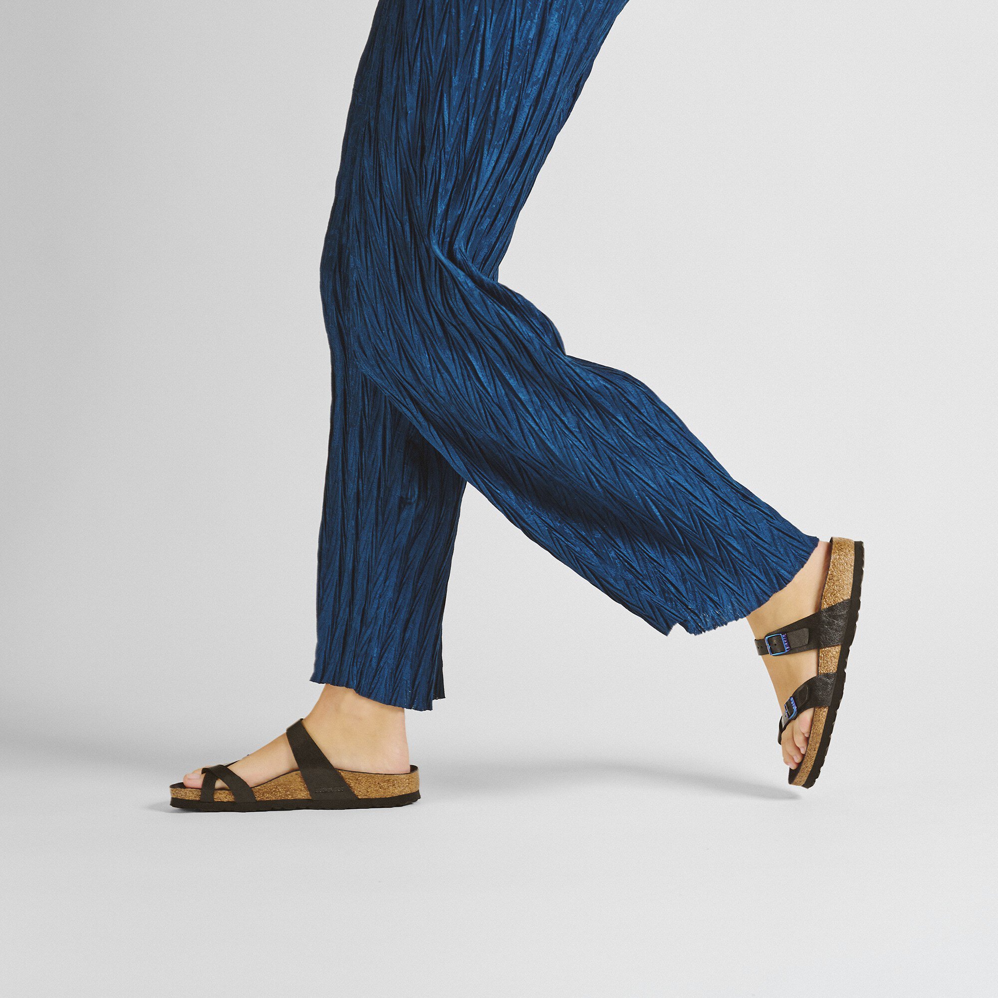 Jaunty and modern! The BIRKENSTOCK Mayari thong sandal stands out with its flowing look and brings together design and comfort. Here, we see the sandal with a silky sheen finish. The color-coordinated details round off the shoe’s look of sophistication. The upper is made from the skin-friendly, hard-wearing synthetic material Birko-Flor®.