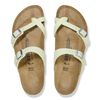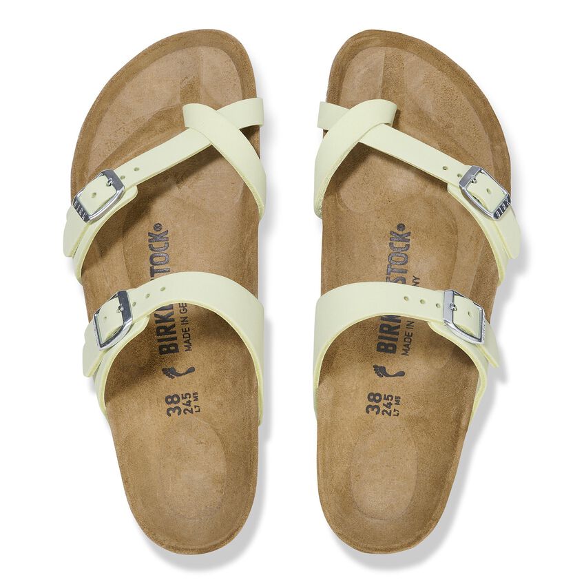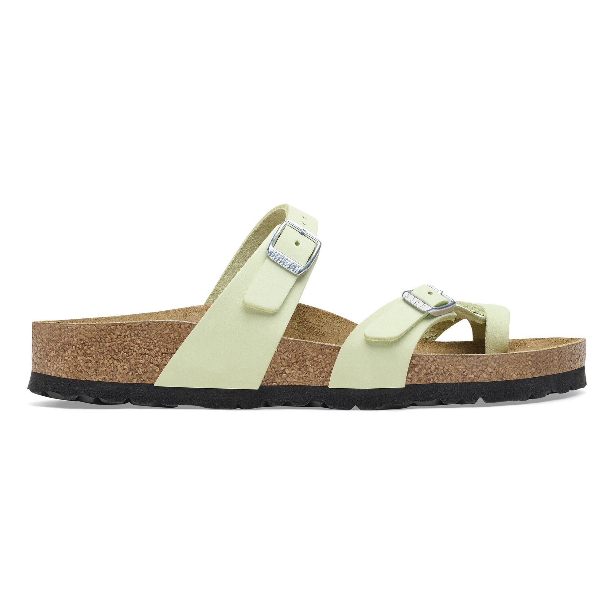 - Jaunty and modern! The BIRKENSTOCK Mayari thong sandal stands out with its flowing look and brings together design and comfort. With its additional foam layer, the soft footbed offers extra comfort and pampers feet – all day long. The upper is made from high-quality, soft nubuck leather that boasts a natural, rustic appearance.
