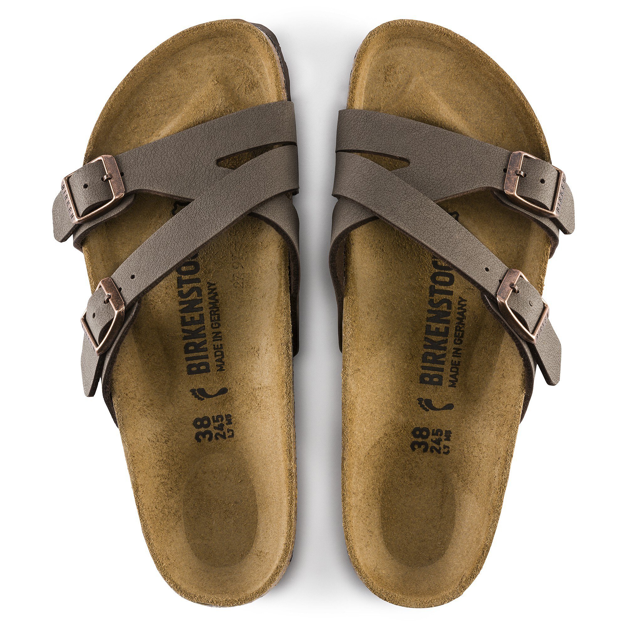 Jaunty and feminine! The svelte BIRKENSTOCK Yara successfully bridges the gap between thong sandal and sandal. The upper is made from the skin-friendly, hard-wearing synthetic material Birko-Flor® in a sophisticated nubuck look which boasts a texture and color that could almost be mistaken for real leather.