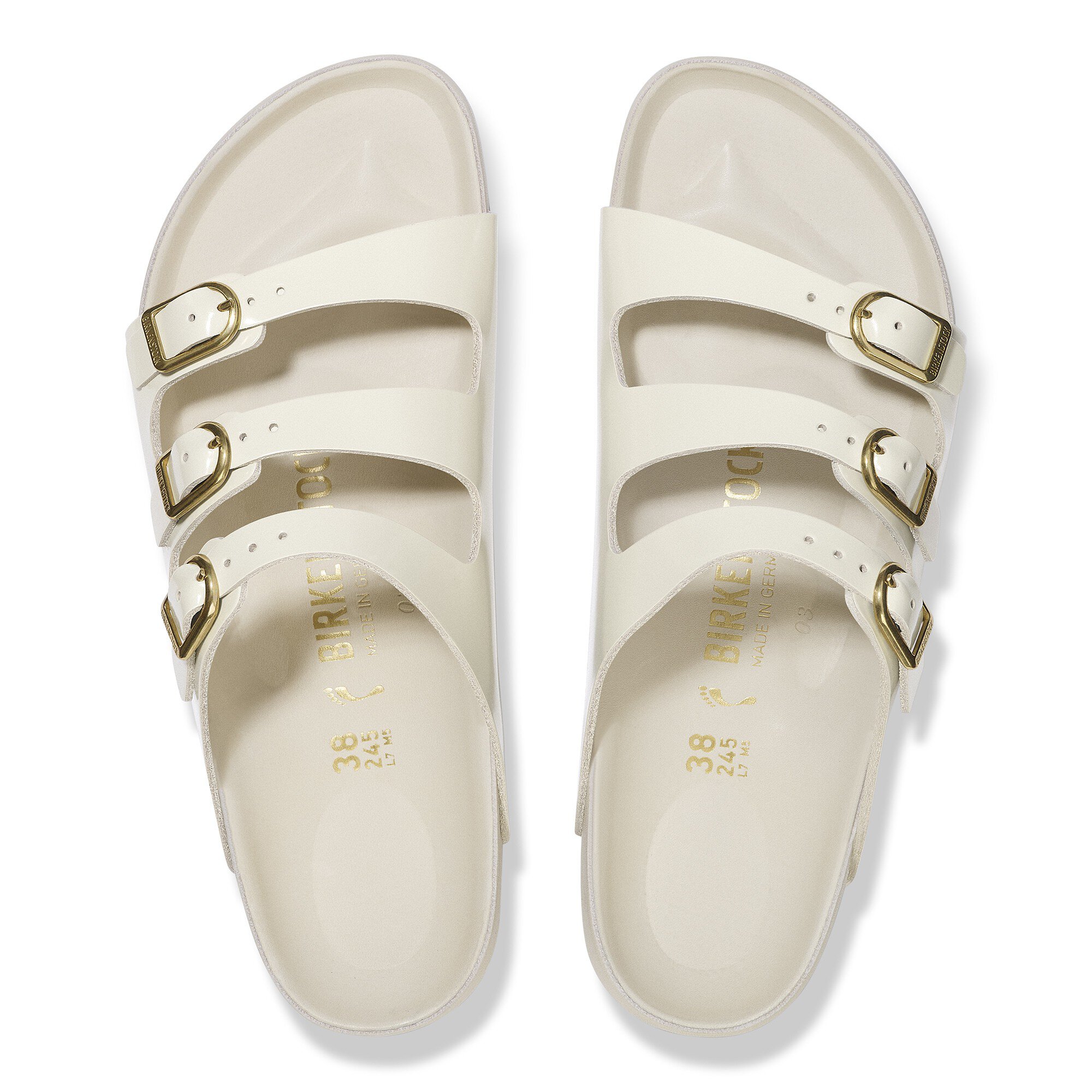 The BIRKENSTOCK Florida is the ideal sandal for anyone who spends a lot of time on their feet. This three-strap sandal offers good grip and maximum comfort. The exquisite footbed is fully lined with soft piumato leather, making it exceptionally comfortable. The delicate D buckles round off the sandal’s elegant appearance. The upper is made from high-quality natural leather with a shiny patent coating.