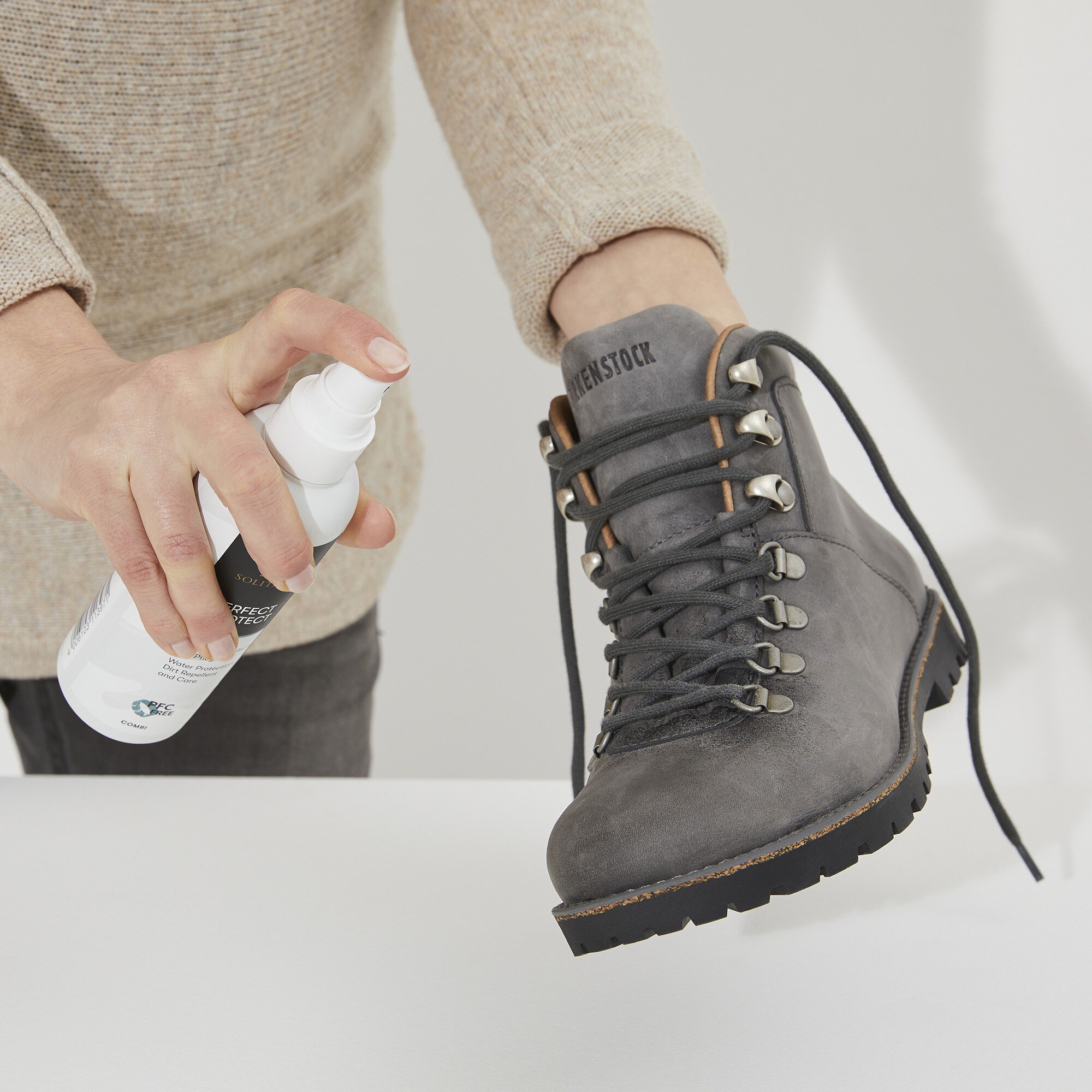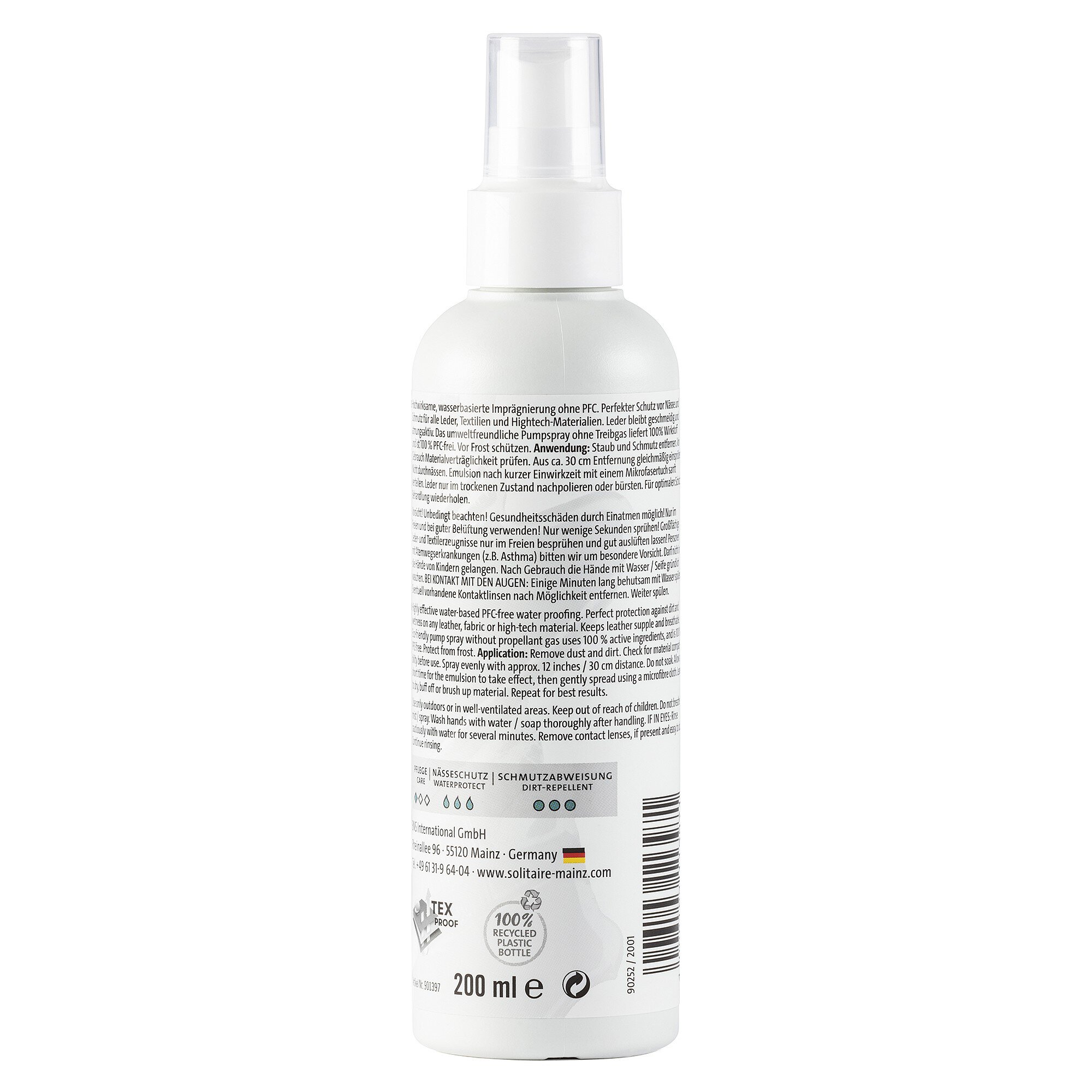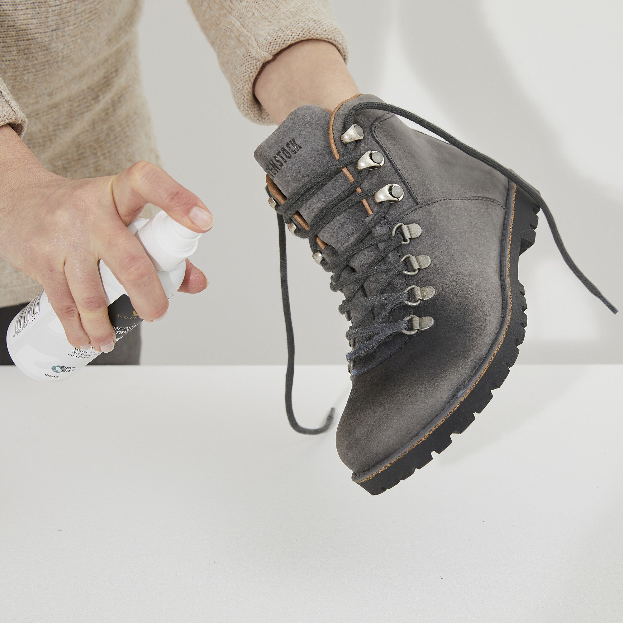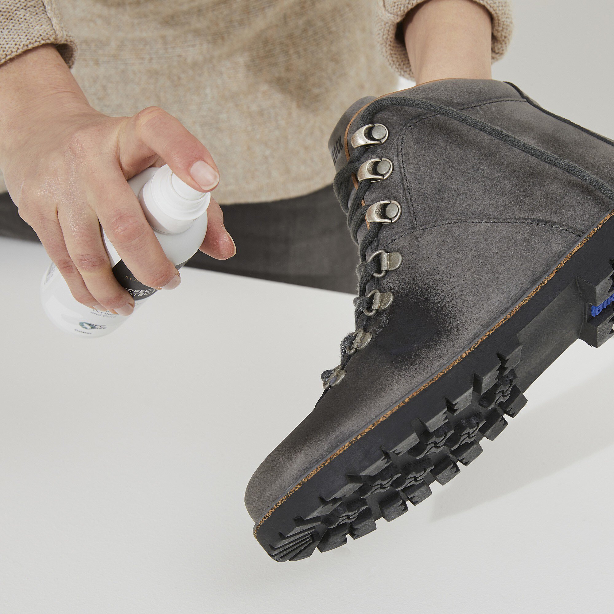 - Application: after removing any coarse dirt and a material compatibility test, spray evenly and from a distance of approximately 30 cm without soaking the material. Let the emulsion take effect for a short time, then rub it in gently with a microfiber cloth and, after drying, polish smooth leather or brush suede if required. To prevent skin irritations, do not apply product on the inside of the shoe.