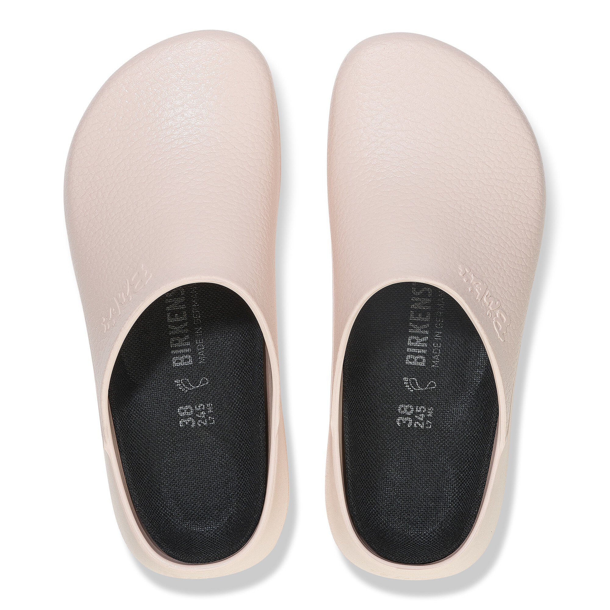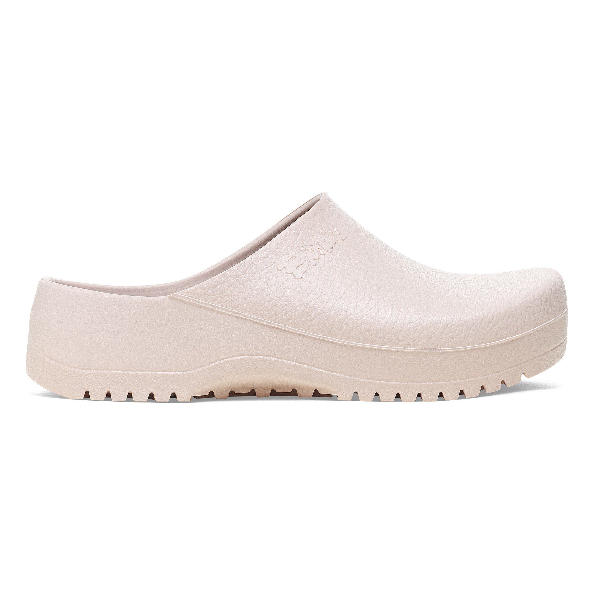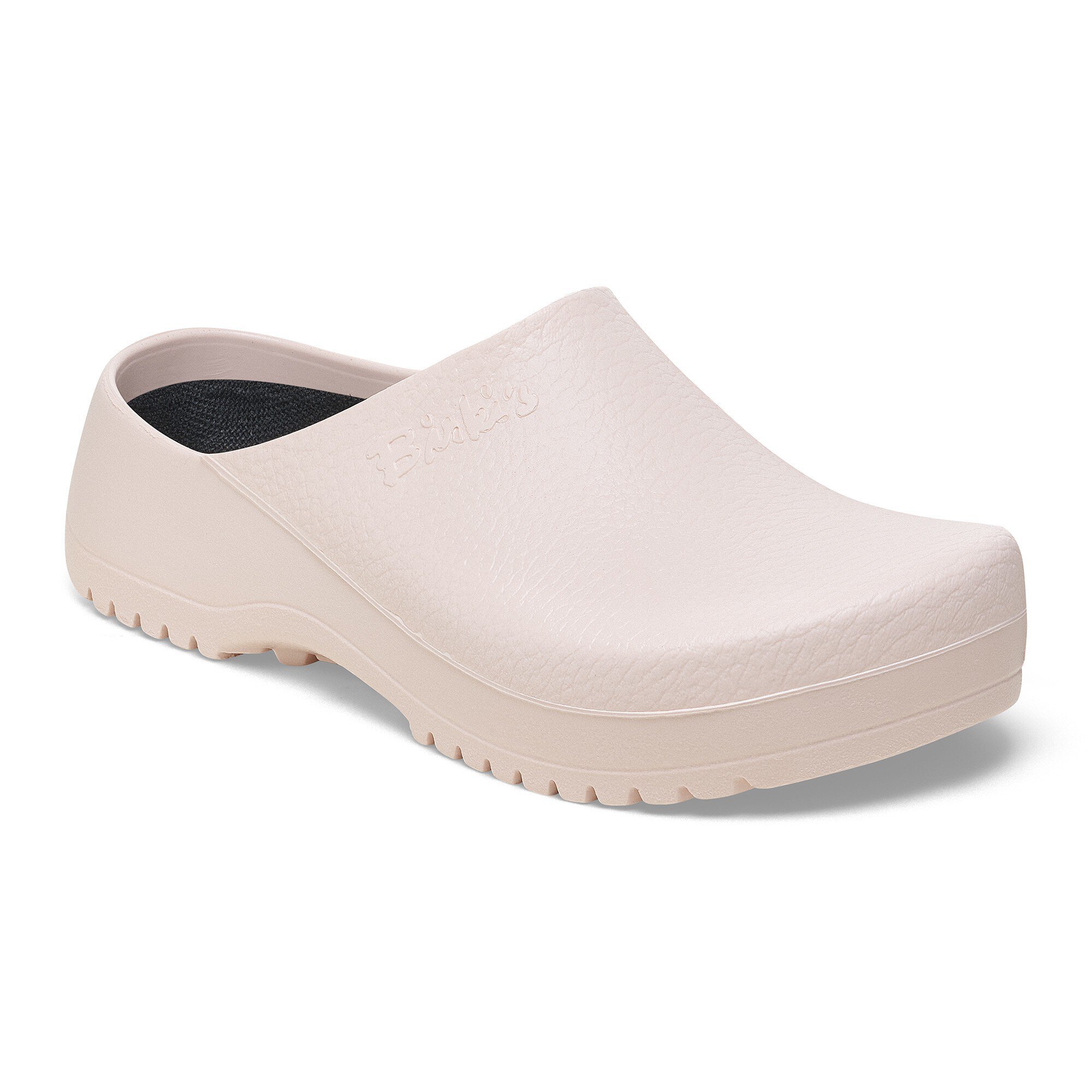 Het ruime palet aan kleuren waarin de Super Birki beschikbaar is, getuigt van zijn veelzijdige toepassingsgebieden, zowel op het werk als in de vrije tijd. Zijn compacte vorm bestaat uit water- en vuilafstotend polyurethaan dat bovendien olie- en vetbestendig is. Dit extreem robuuste materiaal kan op maximaal 60 °C gewassen en effectief gedesinfecteerd worden. Dankzij zijn duurzaamheid en hygiënische eigenschappen is hij uitstekend geschikt voor keuken, gezondheidszorg en voedingsmiddelenindustrie – maar ook als handige tuinklomp. Het anatomisch gevormde kurk-latex voetbed is bekleed met een vochttransporterend textielweefsel. Het is uitneembaar en kan op maximaal 30 °C worden gewassen.
