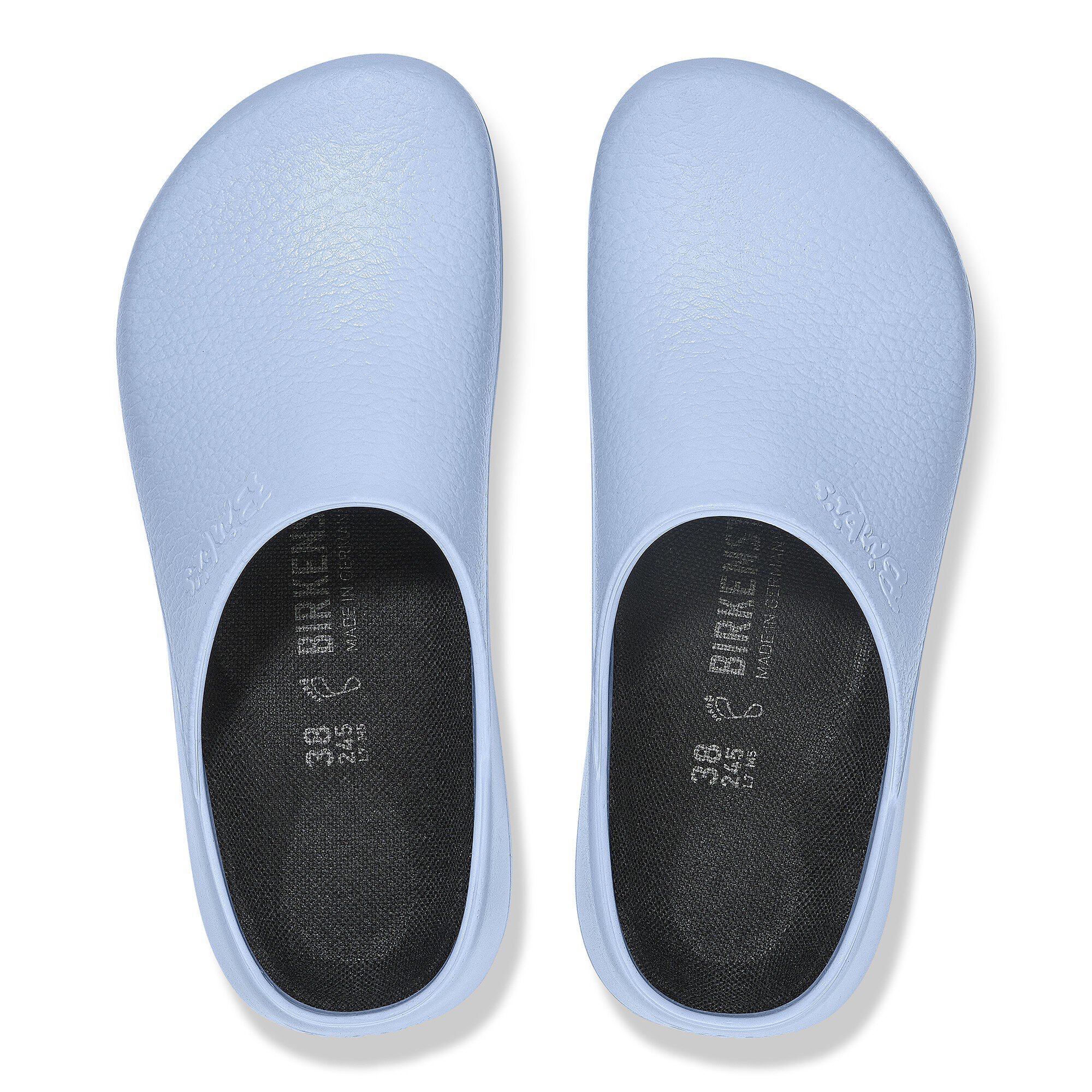 Het ruime palet aan kleuren waarin de Super Birki beschikbaar is, getuigt van zijn veelzijdige toepassingsgebieden, zowel op het werk als in de vrije tijd. Zijn compacte vorm bestaat uit water- en vuilafstotend polyurethaan dat bovendien olie- en vetbestendig is. Dit extreem robuuste materiaal kan op maximaal 60 °C gewassen en effectief gedesinfecteerd worden. Dankzij zijn duurzaamheid en hygiënische eigenschappen is hij uitstekend geschikt voor keuken, gezondheidszorg en voedingsmiddelenindustrie – maar ook als handige tuinklomp. Het anatomisch gevormde kurk-latex voetbed is bekleed met een vochttransporterend textielweefsel. Het is uitneembaar en kan op maximaal 30 °C worden gewassen.