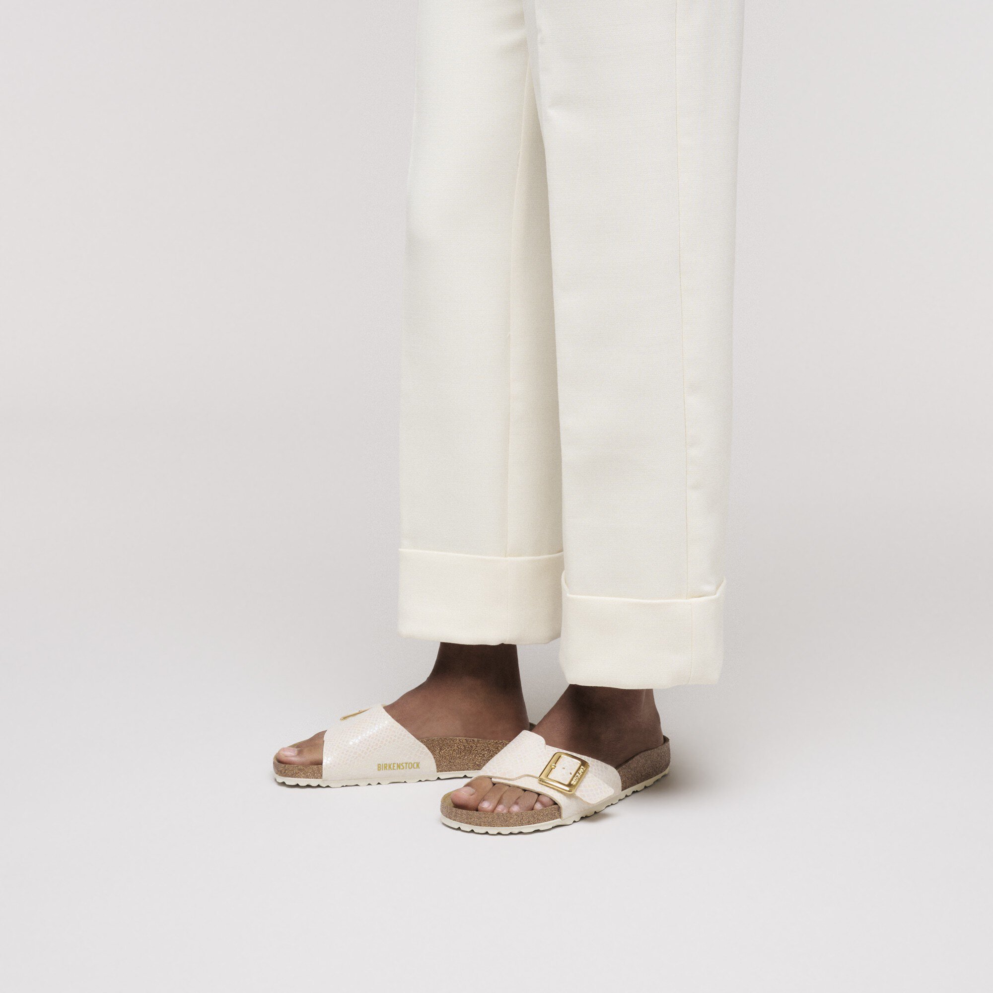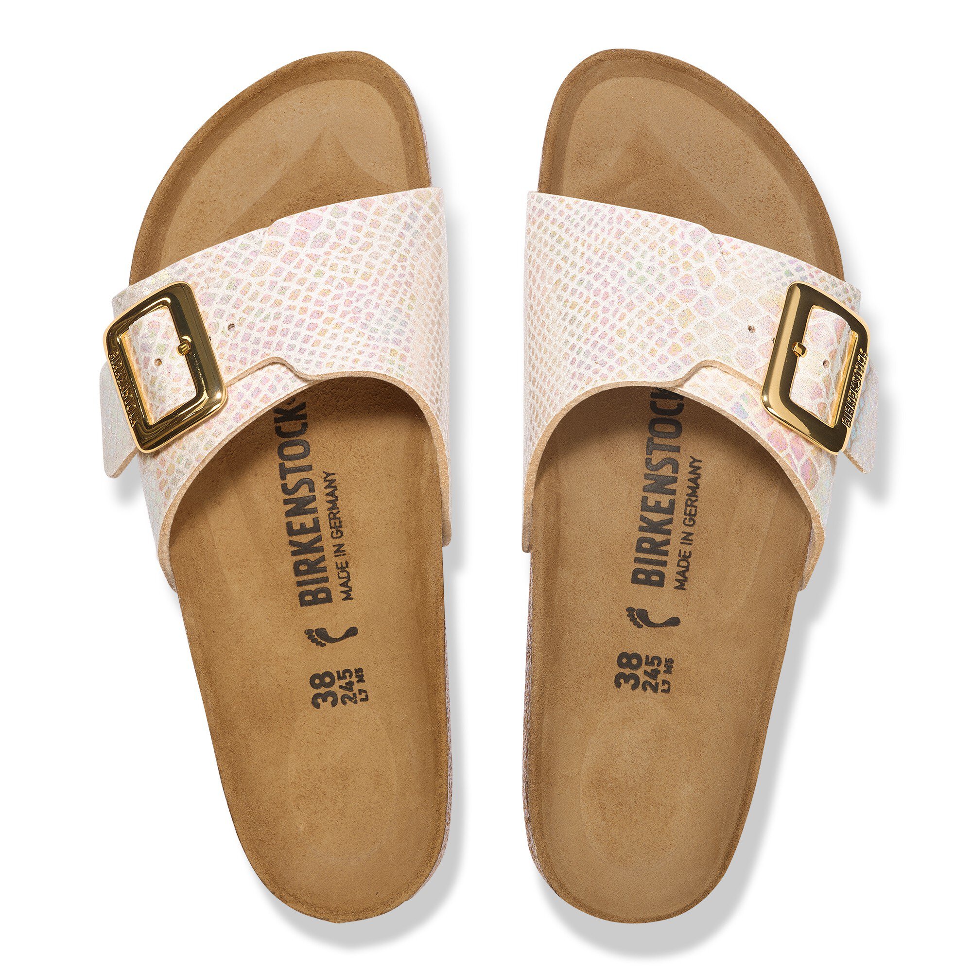 The design of the BIRKENSTOCK Catalina was inspired by the classic Madrid with a strap and metal buckle. The slightly wider strap lends this sandal a modern and elegant appearance. This version comes in a shiny snake design and exudes elegance and a touch of extravagance thanks to the iridescent metallic foil and the snakeskin look. Inspired by nature, no two shoes have the same look and feel. The shiny, gently rounded padded buckles are especially eye-catching. The upper is made from a skin-friendly synthetic material.