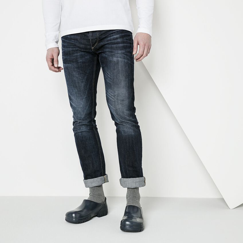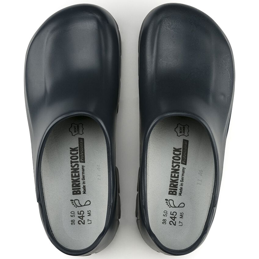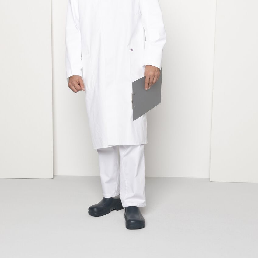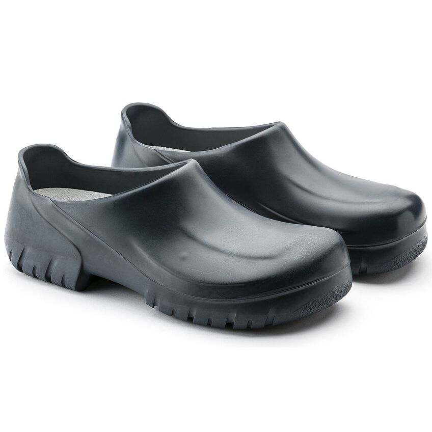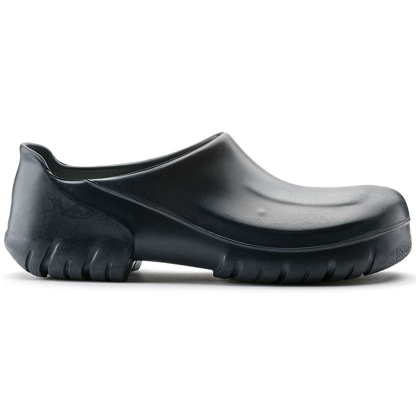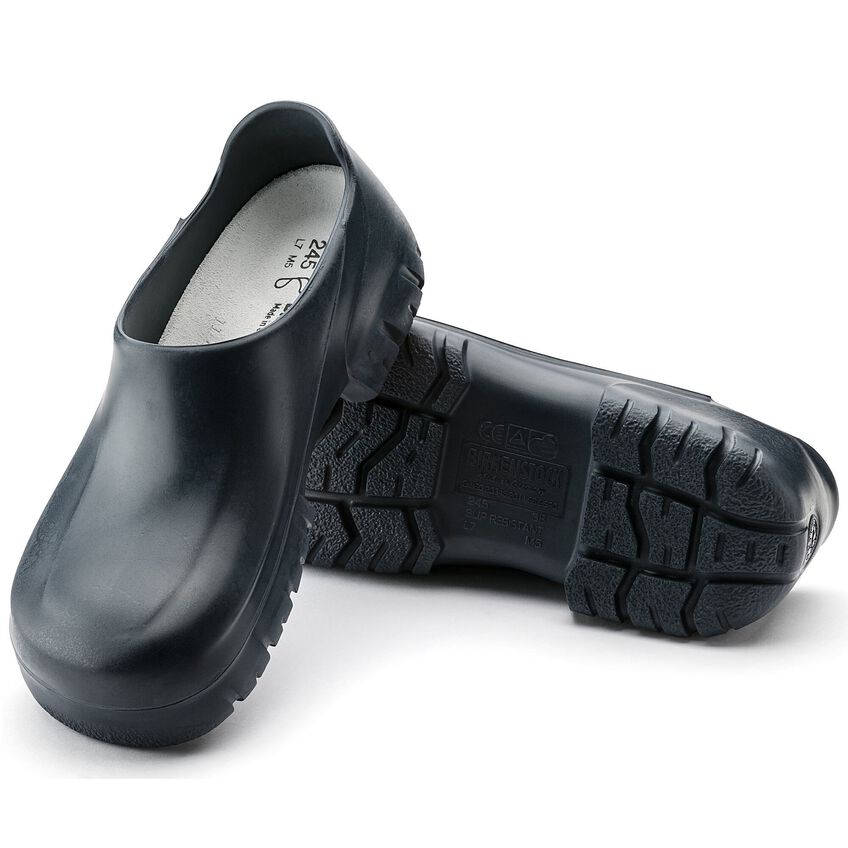 The A 640 PU clog covers all bases when it comes to stringent hygiene standards and reliable nonslip properties. Its enclosed design and the nonslip treaded sole offer reliable grip and maximum sure-footedness in kitchens and the food industry. Its solid steel toe cap protects toes and the front of the foot from impacts of up to 200 joules. Its oil- and grease-resistant material is also water-resistant, allowing it to be cleaned efficiently and thoroughly. This involves removing the cork-latex footbed and washing the clog at up to 80° Celsius. Both parts of the shoe are suitable for daily disinfection. The anatomically shaped original BIRKENSTOCK footbed protects joints and tendons, and is also washable at up to 30° Celsius. The footbed is available separately and can therefore be replaced if necessary. The A 640 model is certified in accordance with EN ISO 20345:2011 SB E (SRC category).