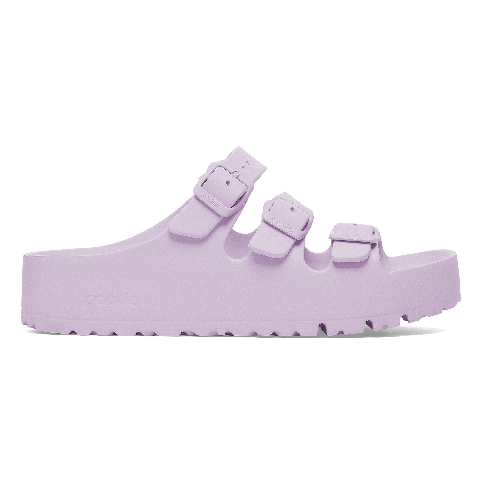 The BIRKENSTOCK Florida is the ideal sandal for anyone who spends a lot of time on their feet. This three-strap sandal offers good grip and maximum comfort. The new platform flex outsole has a wider heel section for increased stability and ideal weight distribution. The updated design with horizontal grooves in the front part improves flexibility and the rolling motion. Modeled on the cork original, this sandal is made from especially light and highly flexible EVA. This high-quality, odor-neutral synthetic material which has been tested for harmful substances is shock-absorbent, water-resistant, and skin-friendly. It is therefore perfect for wearing on the beach, in the garden, or in wellness and spa areas.