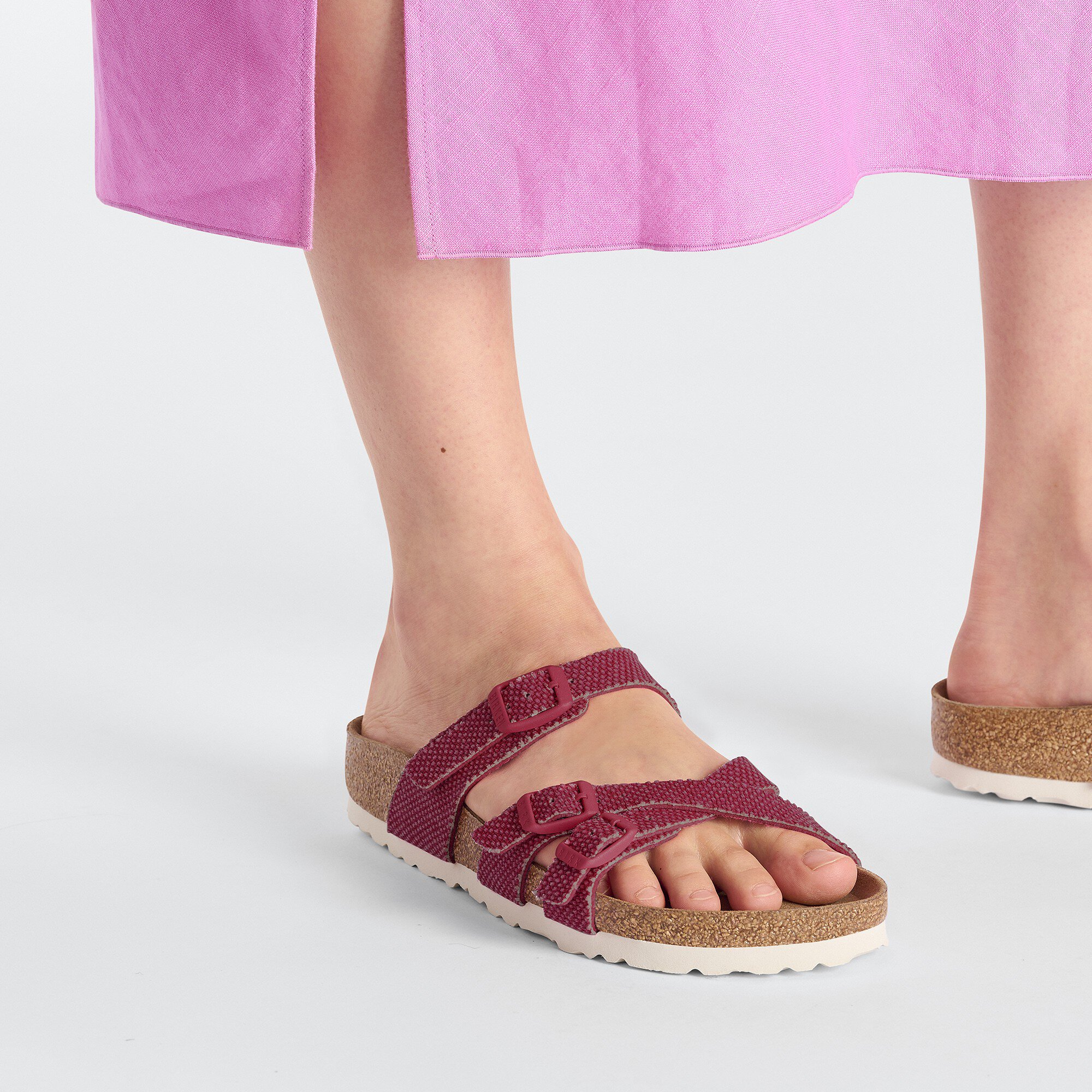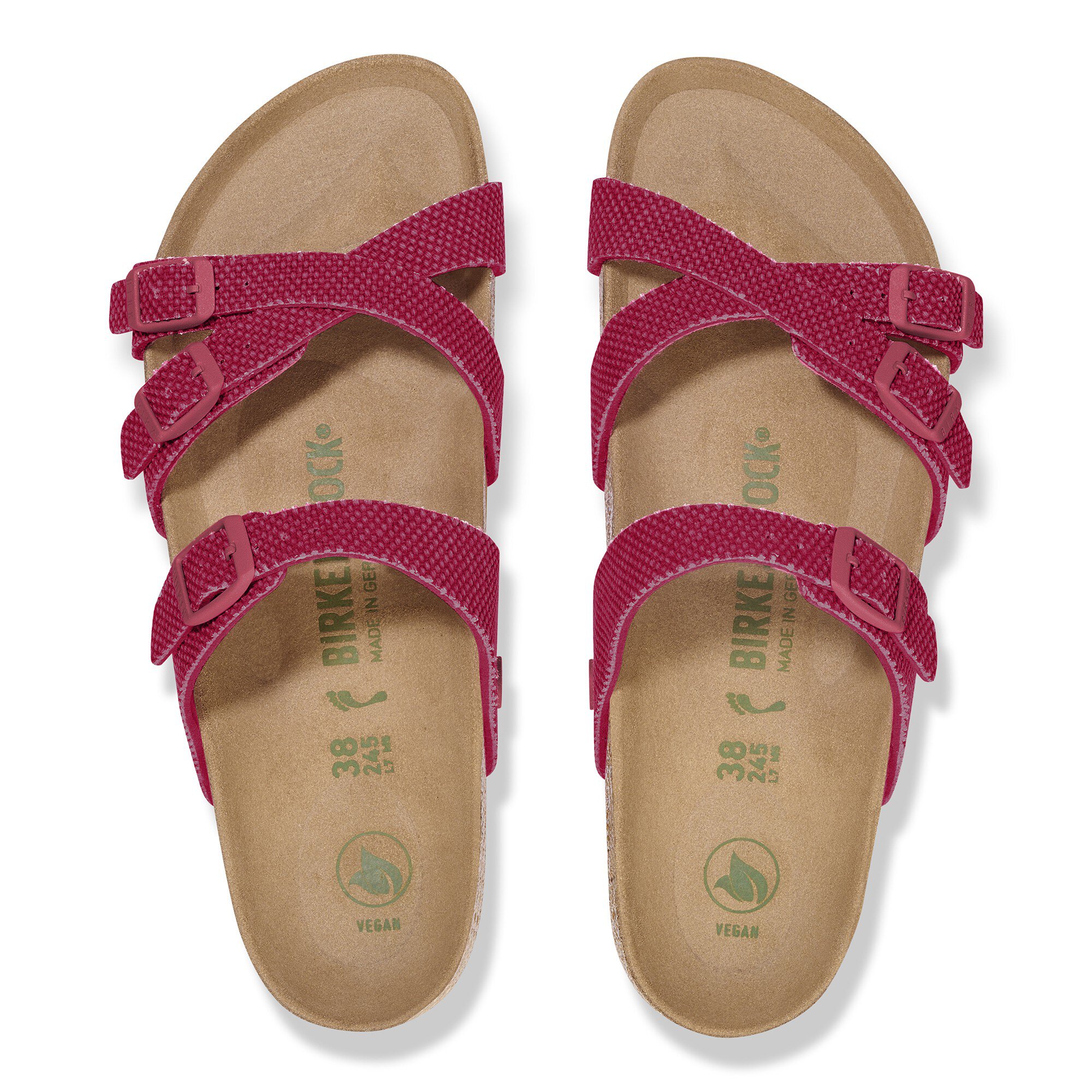 The BIRKENSTOCK Franca is a jaunty sandal with slim cross-over straps. This version boasts a natural canvas look. It has been given an update in a new material, with a vegan version now available. It is entirely free of animal products, as verified by independent testing laboratories. The color-coordinated details round off the shoe’s look of sophistication. The upper is made from smooth fabric.