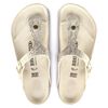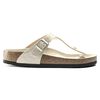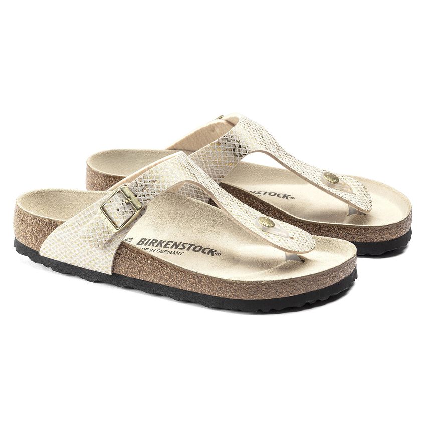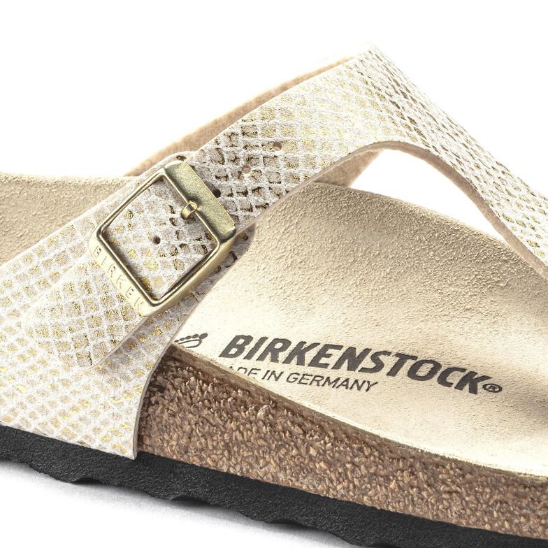 The BIRKENSTOCK Gizeh is a genuine classic that combines optimum grip with minimalist, fashionable design. The subtle python embossing lends the sandal its own unique character. Subtle metallic glitter effects accentuate the glamorous look. Inspired by nature, no two shoes have the same look and feel. The upper is made from skin-friendly microfiber.